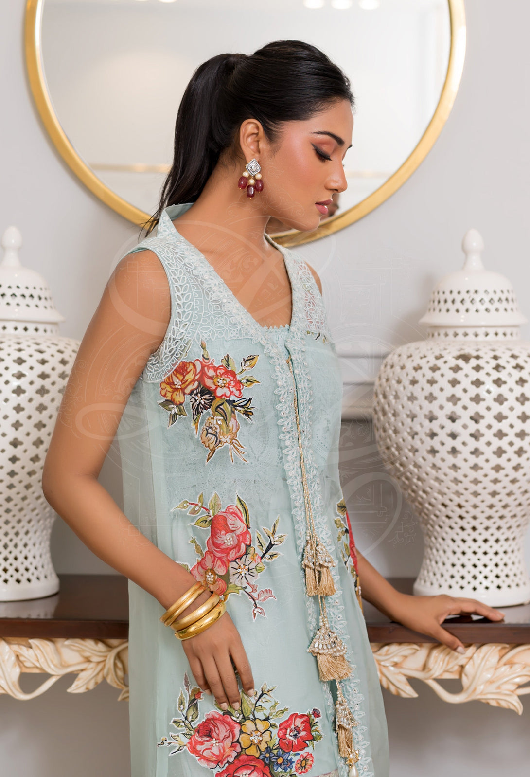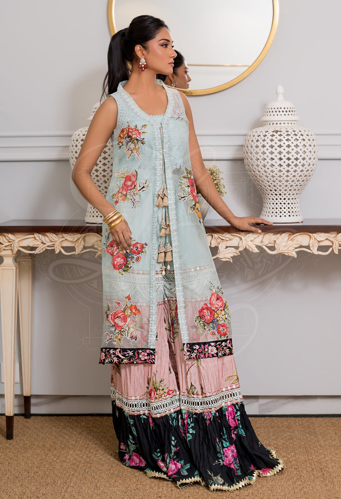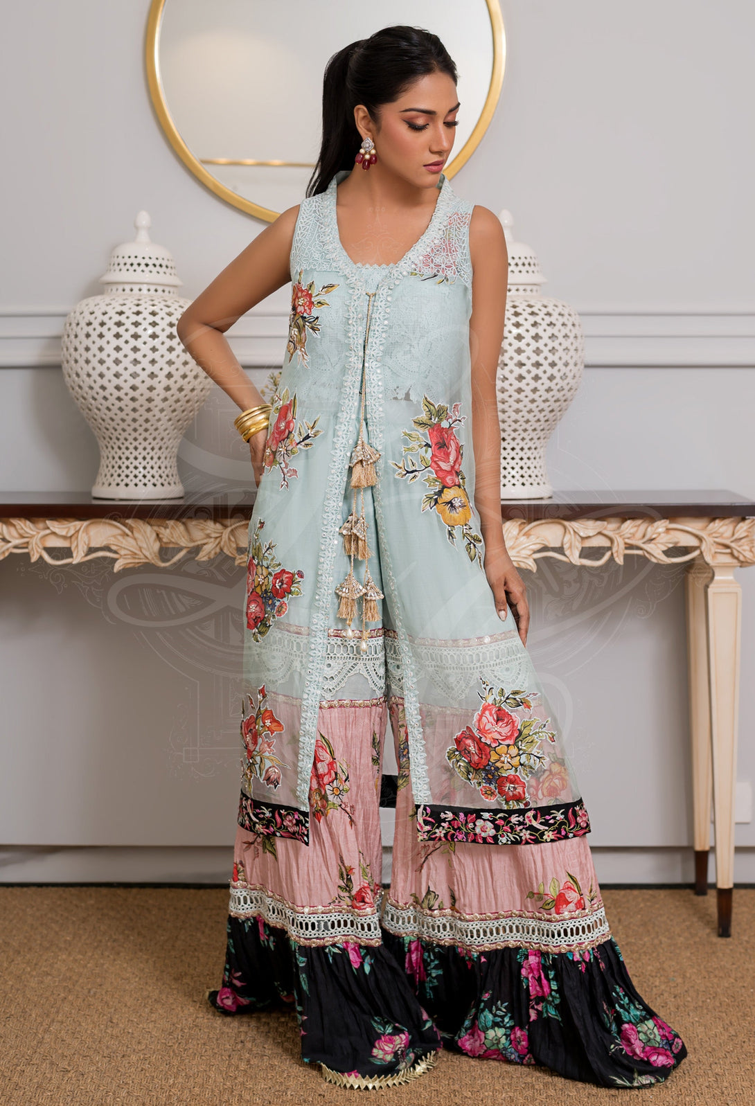 The look is completed with a layered floral gharara in pink, aqua, and black tones—adorned with playful tassels that sway with every step. A true fusion of color, texture, and tradition, this outfit is designed to stand out at festive occasions and intimate soirées alike.