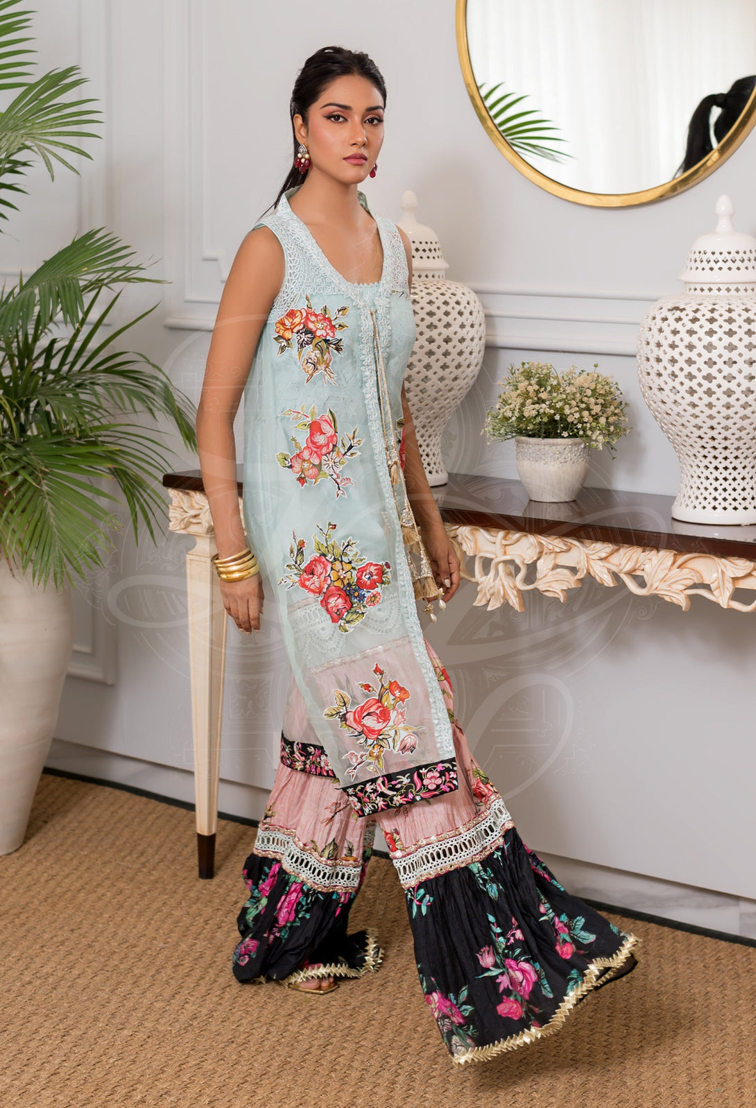 Color Palette: Aqua Blue (Top), Multicolor Floral (Gharara)