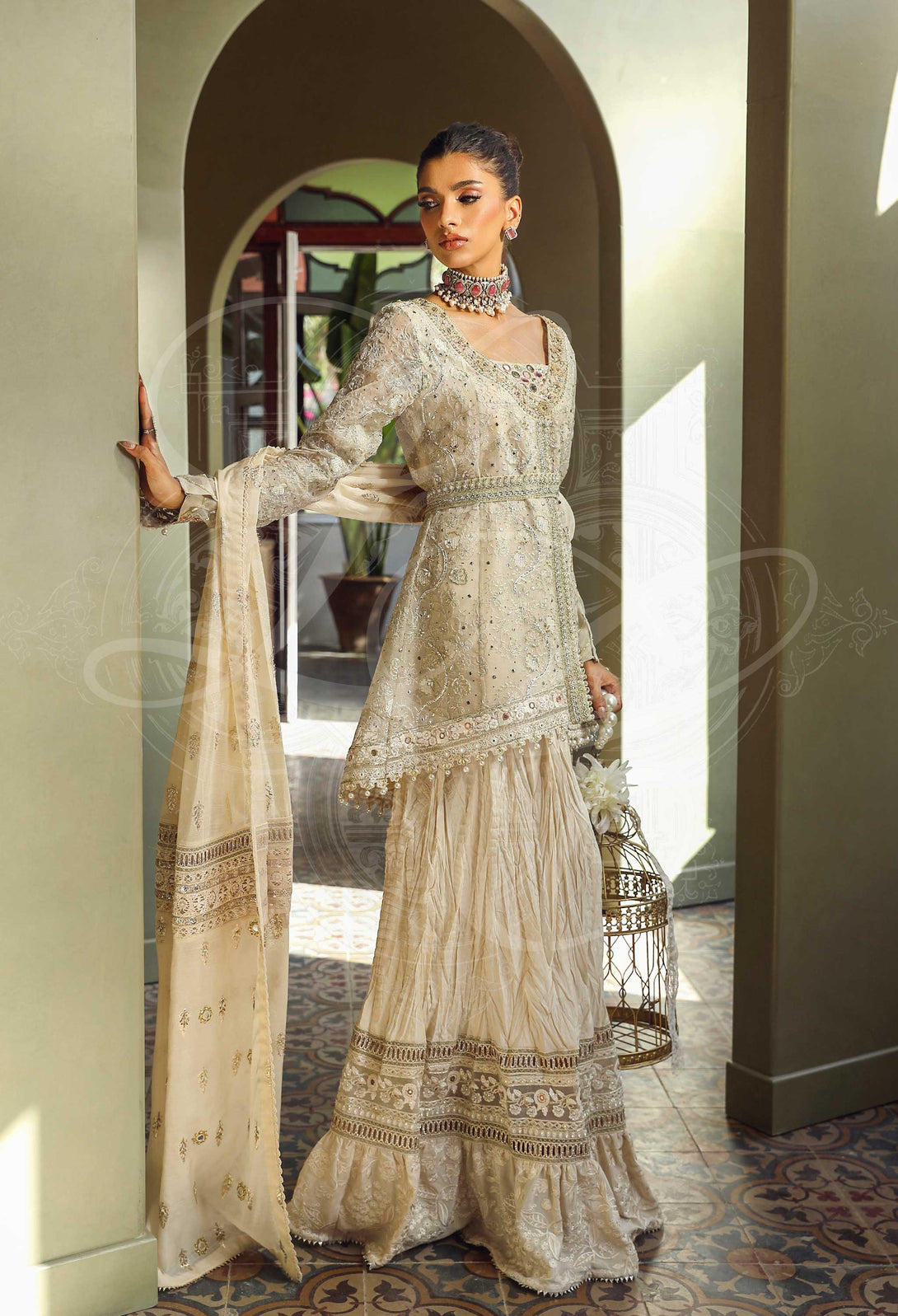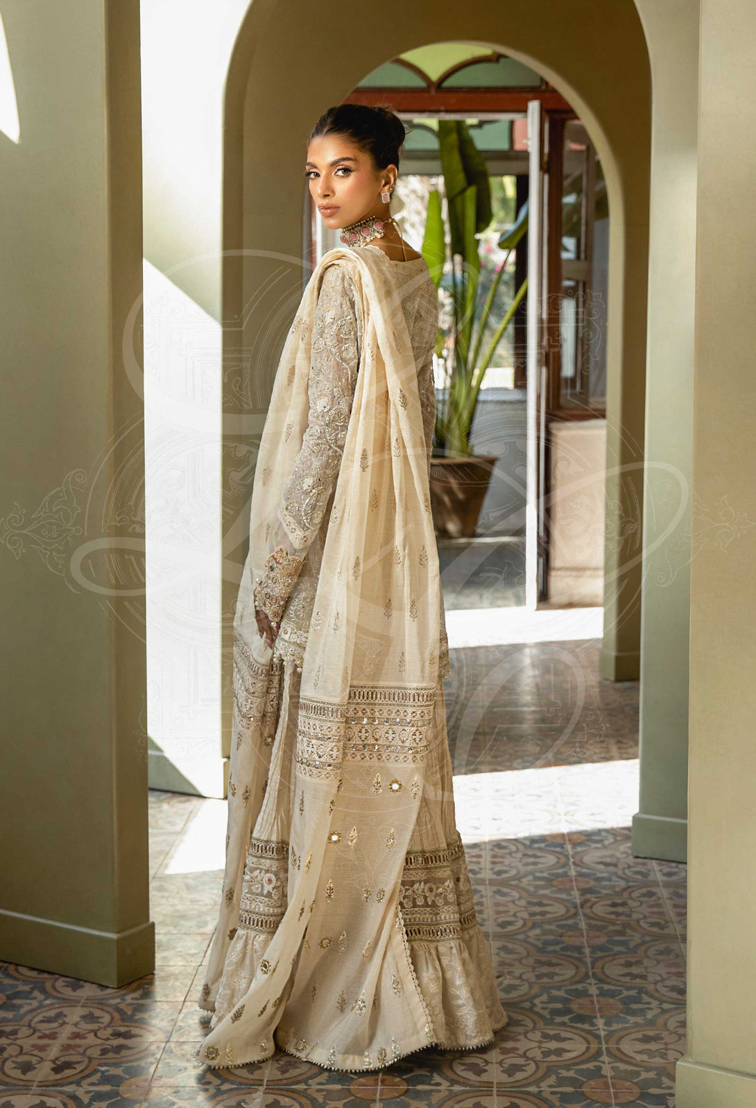 The outfit is beautifully paired with a crushed, layered gharara featuring eye-catching cutwork in a soft rose gold hue, offering movement and flair. The ensemble is completed with a boti-adorned dupatta, thoughtfully designed with Chikankari and mirror paneling, delivering a sophisticated finish.