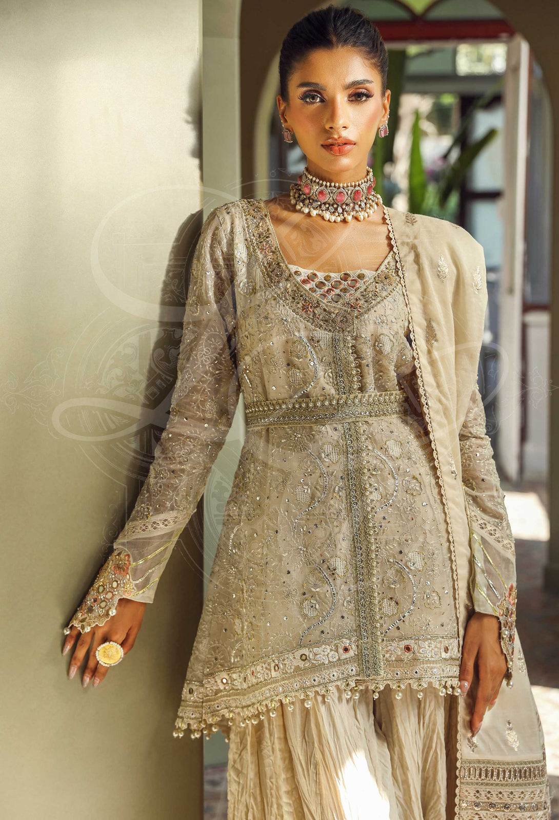 Zoya is a breathtaking luxury pret wear ensemble that effortlessly blends traditional craftsmanship with a refined, contemporary silhouette. The elegant beige peplum top is adorned with delicate Chikankari embroidery, shimmering Kaamdani work, and reflective mirror detailing, creating a look that radiates understated glamour.