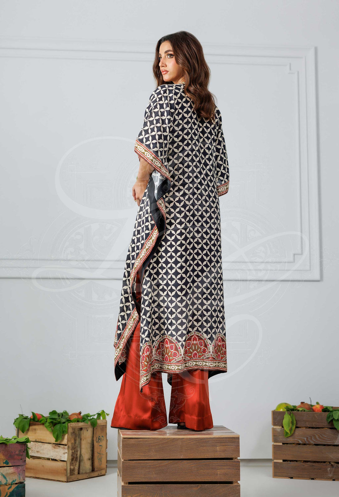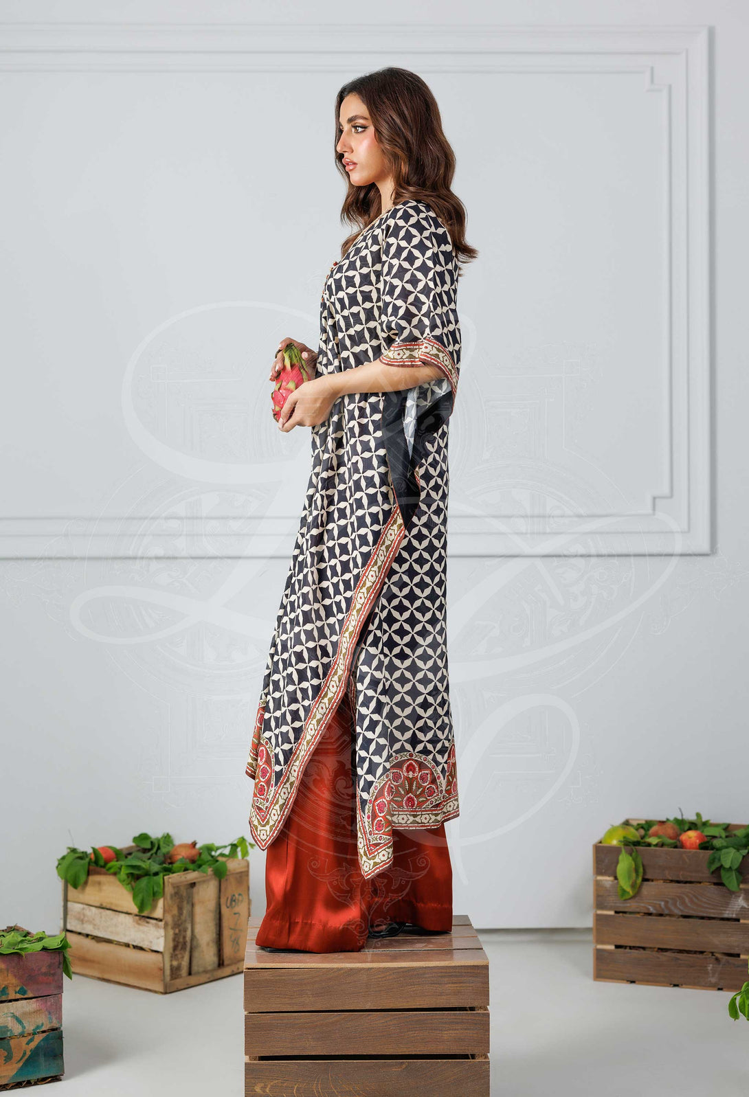 Mia – Monochrome Printed Kaftan with Flared Rust Pants