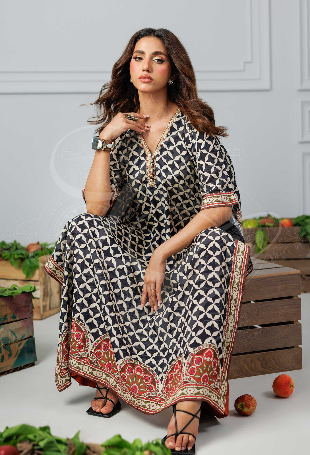 Black and white printed kaftan: Features bold floral and geometric motifs.