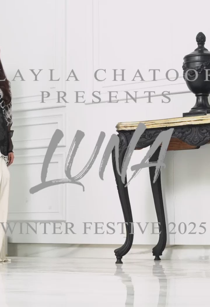 Make a bold yet graceful entrance in Renee, a signature Layla Chatoor creation that redefines luxury pret wear. This elegant black peplum coat is tailored to perfection and adorned with crisp white embroidery, creating a striking contrast. Delicate pearl and crystal embellishments add a subtle shimmer, lending a refined opulence to the overall look.