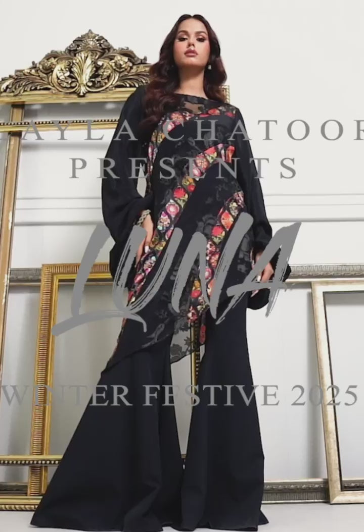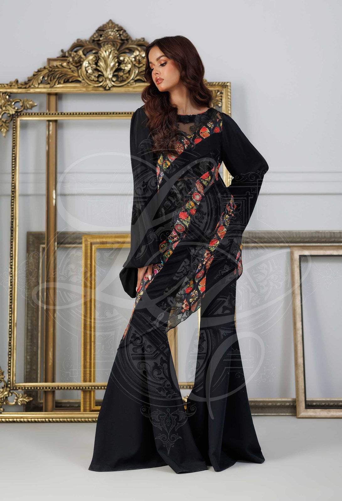 Dina is where contemporary edge meets playful charm — a black asymmetrical top that redefines pret wear with its sleek design and dynamic detailing. The standout feature is the burst of vibrant floral-striped accents, adding an unexpected splash of colour that energizes the entire look. The angled hemline lends movement and individuality, while the ornate neckline pattern infuses a subtle sense of artistry and refinement.