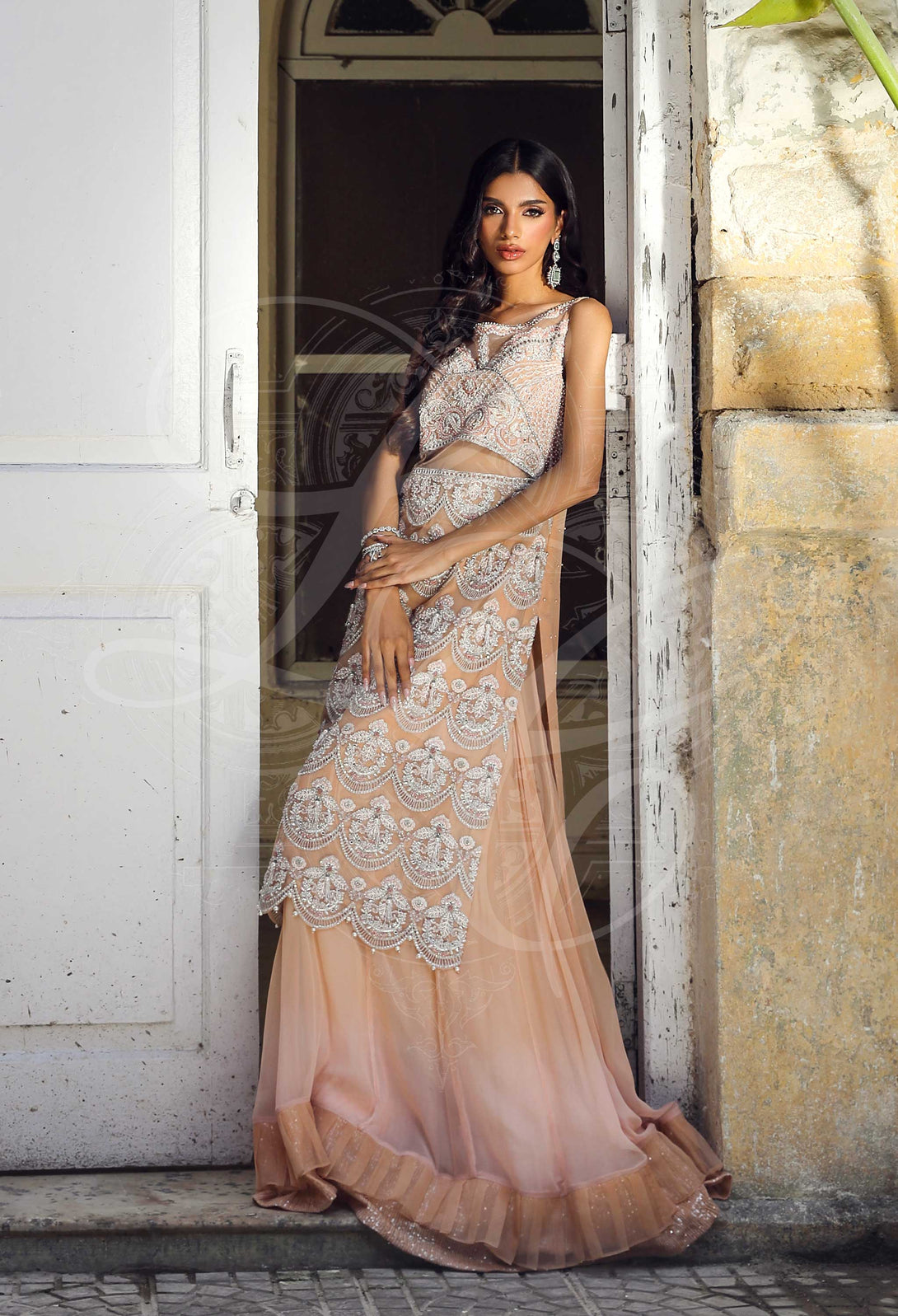 Chic, graceful, and full of character, Lirien is a luxury pret wear ensemble that effortlessly balances timeless elegance with a touch of whimsy. The long caramel blush top is beautifully enhanced with scallop-inspired cutwork and intricate embellishments in soft silver and blush pink—creating a delicate contrast that draws the eye.