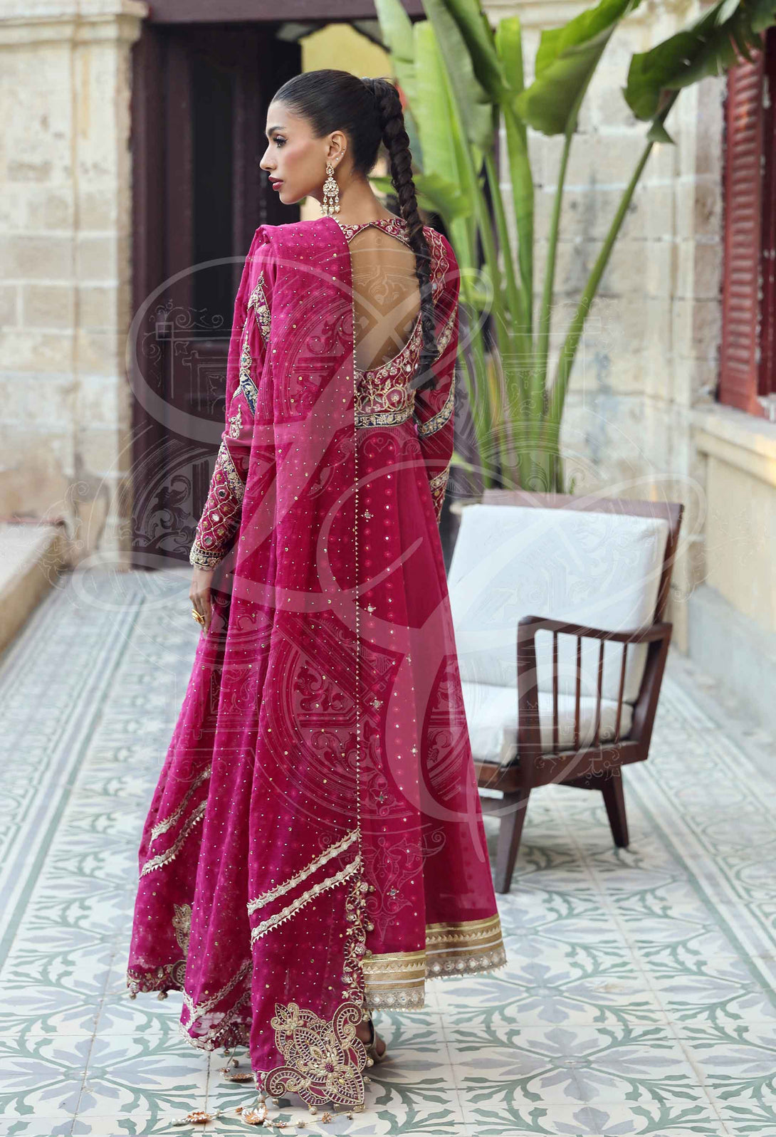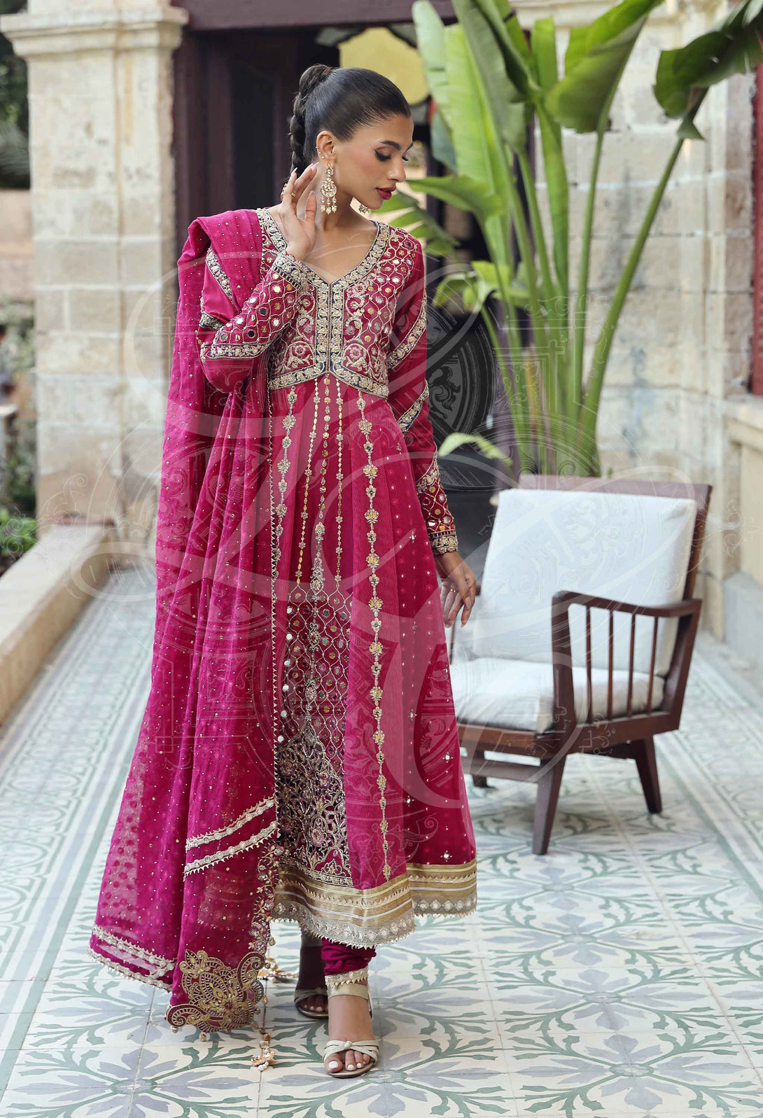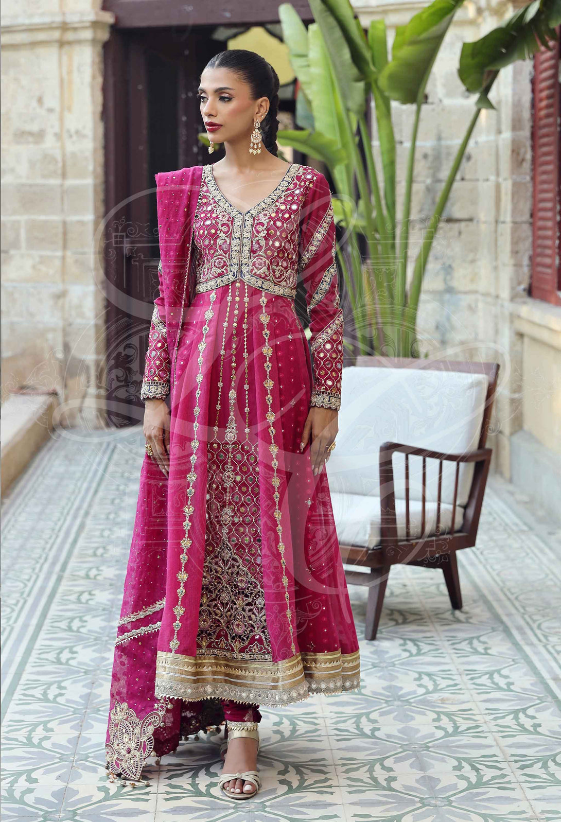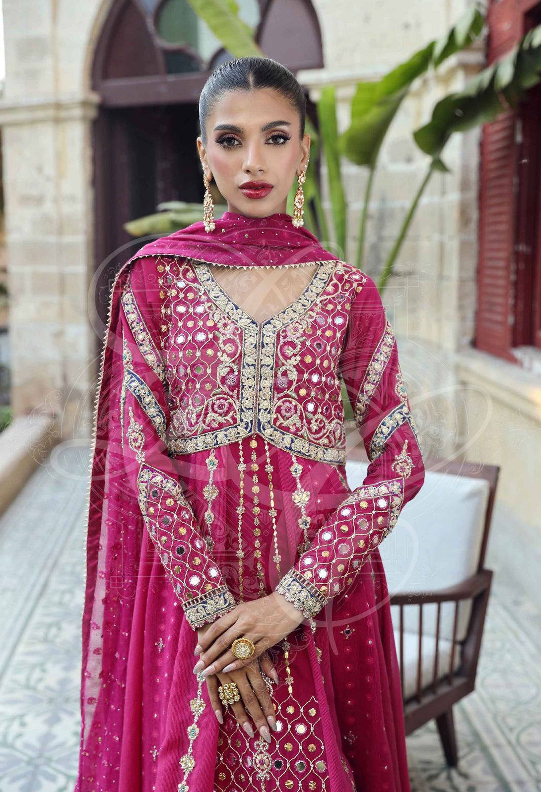 Nour is a captivating luxury pret wear piece that effortlessly combines tradition with modern flair. The mesmerizing fuchsia pink angrakha is adorned with intricate mirror work and bespoke floral and chevron-inspired embroidery, creating a striking visual appeal. Gold and silver accents along the hemline lend an added touch of sophistication, giving the ensemble a radiant aura.