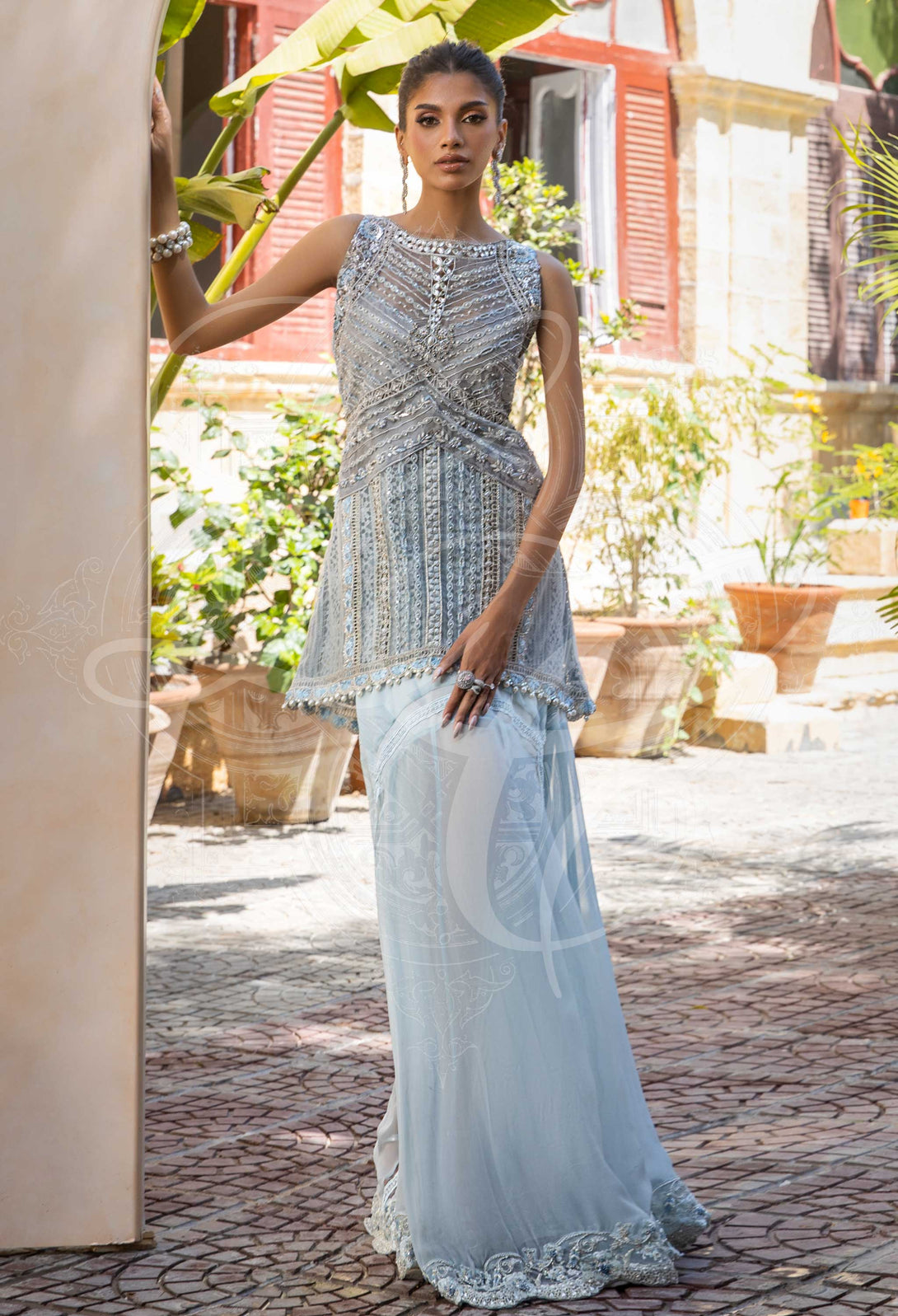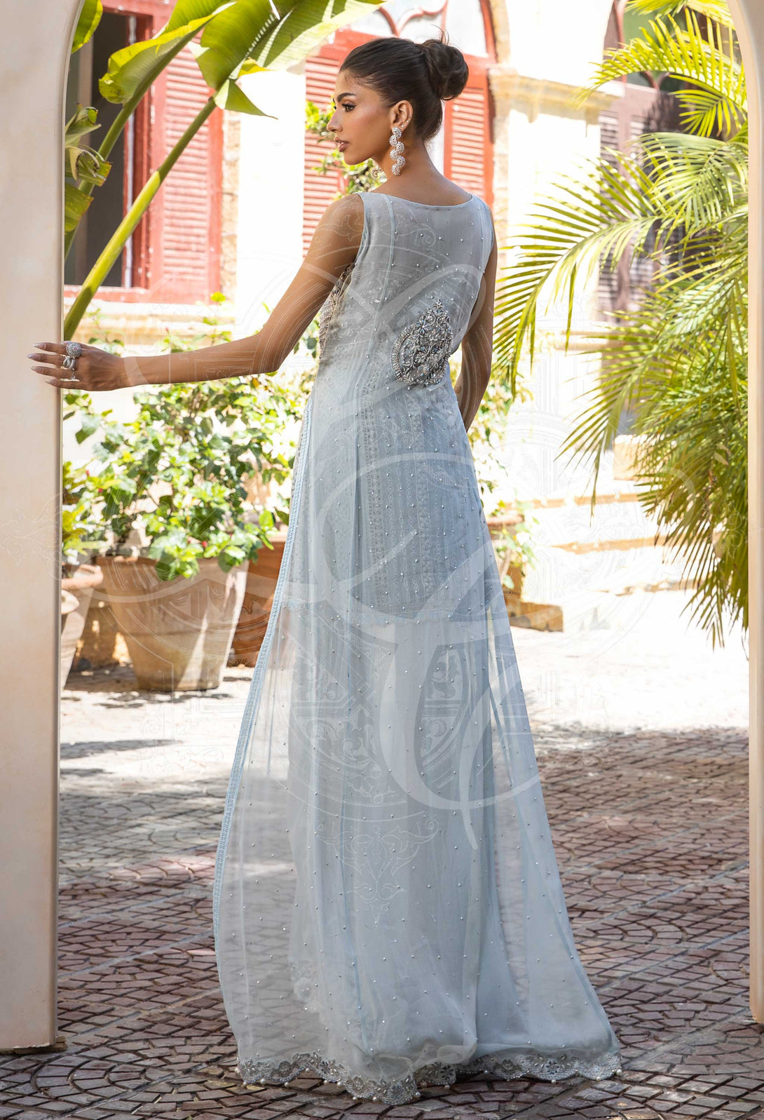 Boldly graceful and visually captivating, Risse is a standout pret wear ensemble that fuses timeless elegance with contemporary edge. The short grey-blue tunic features a statement long trail at the back, creating dramatic movement and a sense of elevated charm. Intricate embellishments in floral and chevron motifs add texture and depth, while the hemline is finished with delicate beadwork for a refined, polished touch.