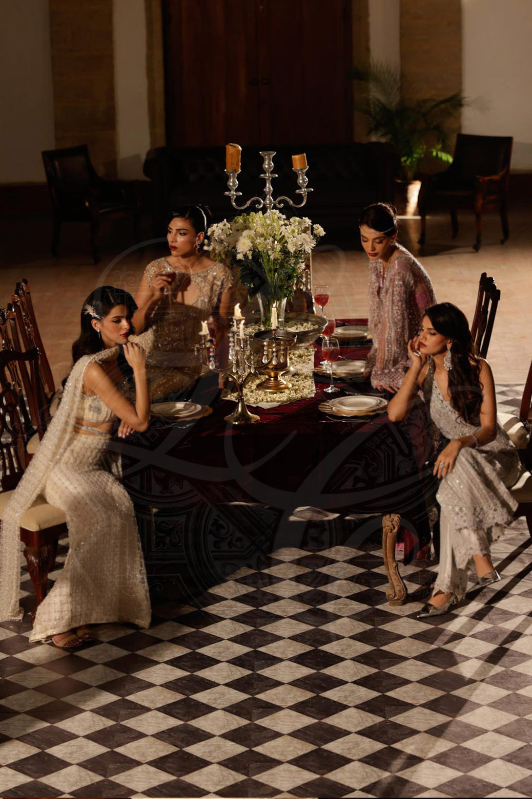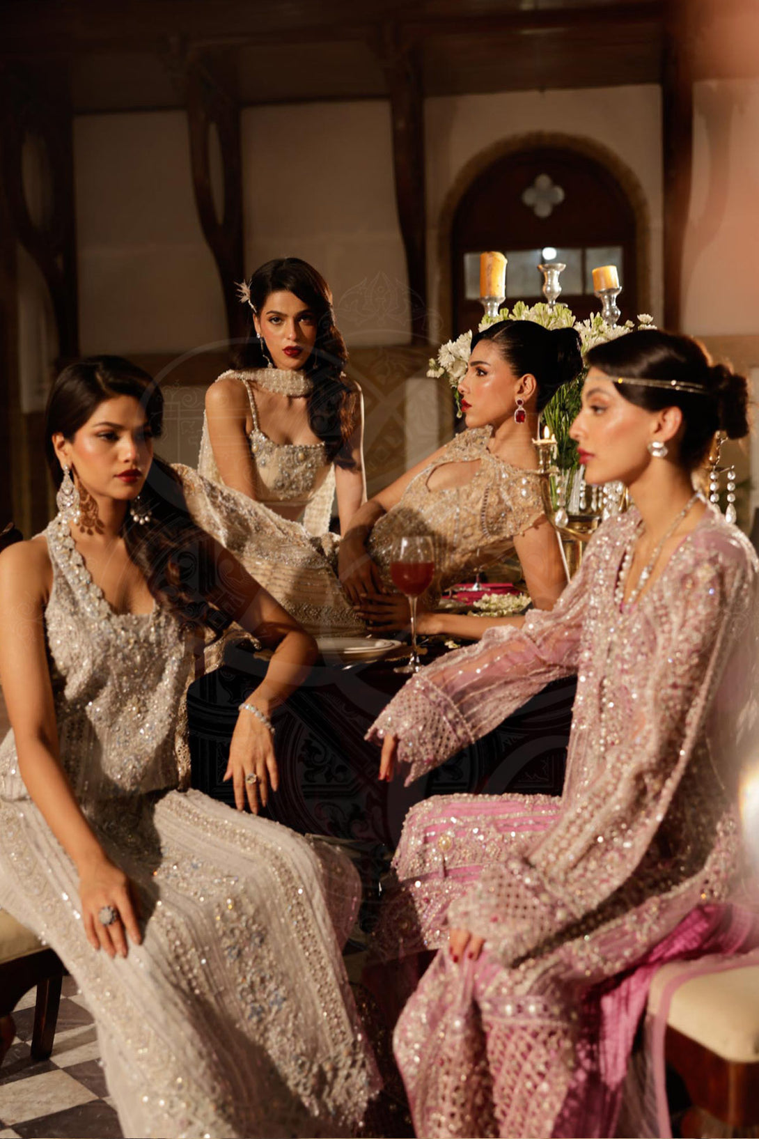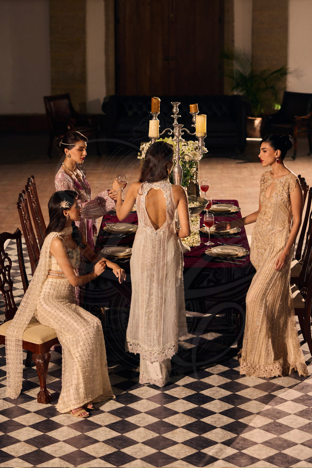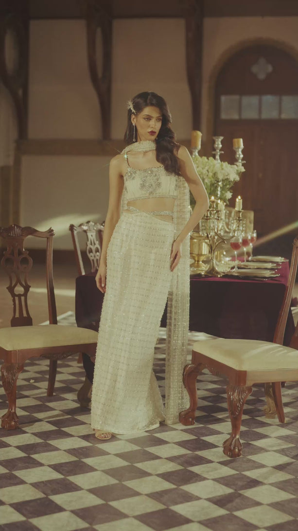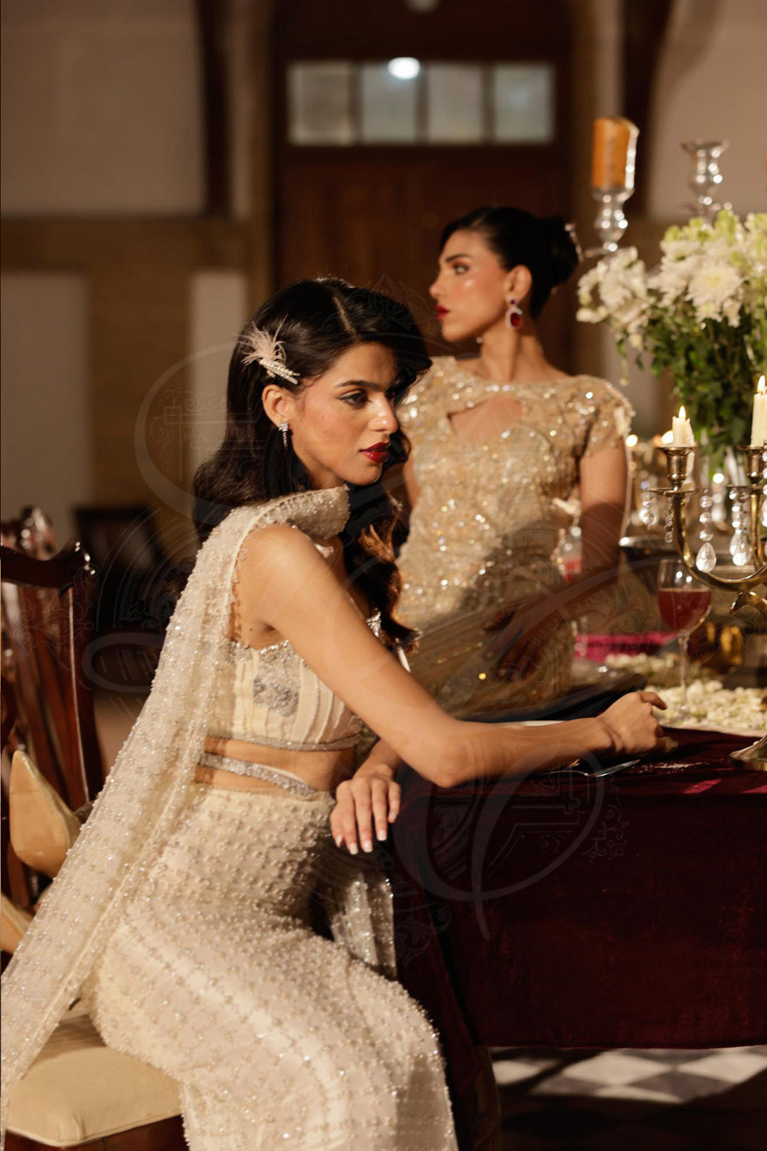 This ivory ensemble captures the essence of refined glamour through its meticulous craftsmanship. The crystal and pearl-encrusted blouse pairs effortlessly with a sequin and pearl-detailed skirt, while the sheer net dupatta with tassels lends a subtle, graceful finish.