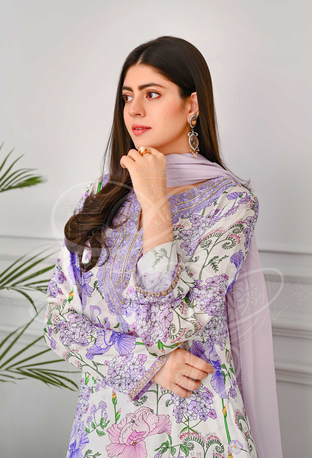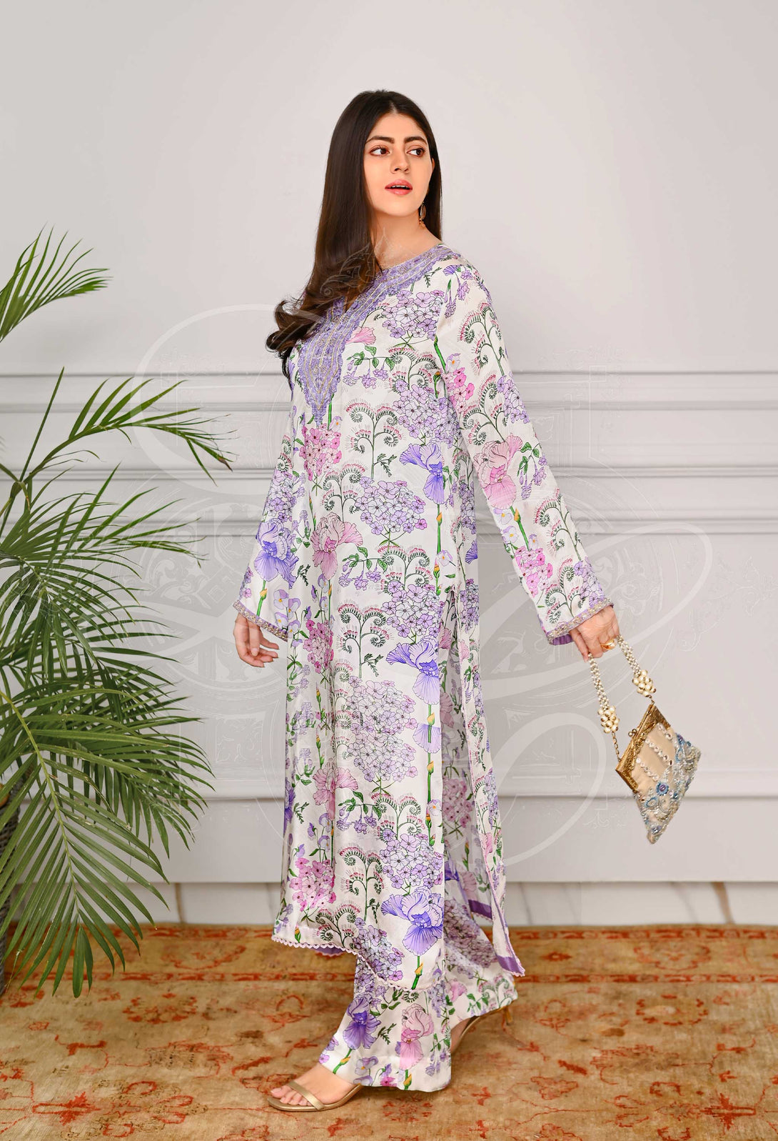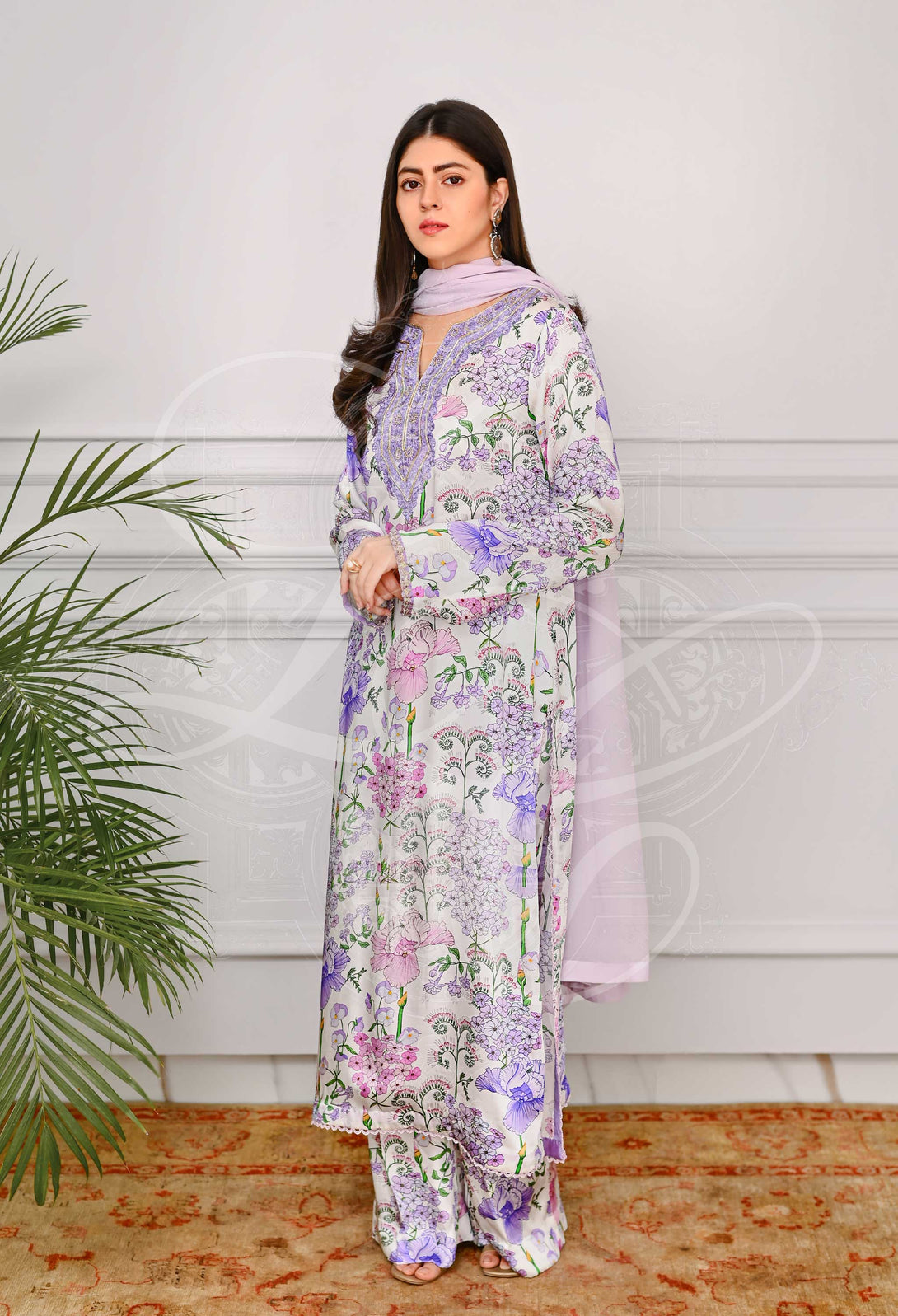 The ensemble is paired with minimalist straight-leg culottes, offering a crisp, tailored profile for everyday refinement. A flowing lavender dupatta complements the set, finished with subtle detailing that adds texture without overpowering the look. Designed for effortless sophistication, Amethyst Bloom brings together polished design with seasonal freshness—ideal for daytime affairs, festive gatherings, or graceful everyday wear.