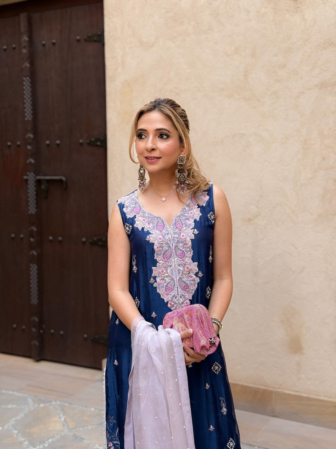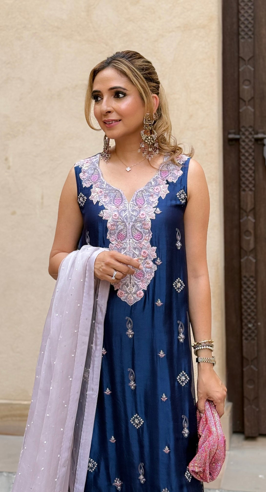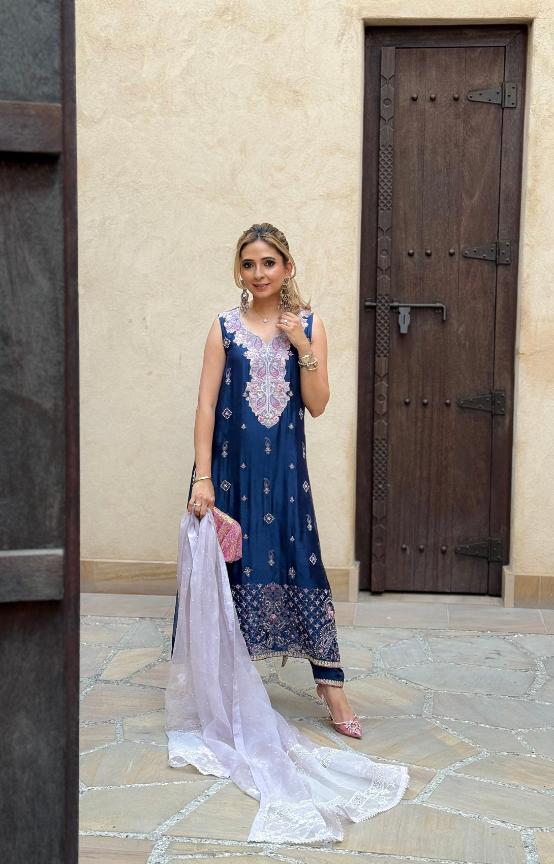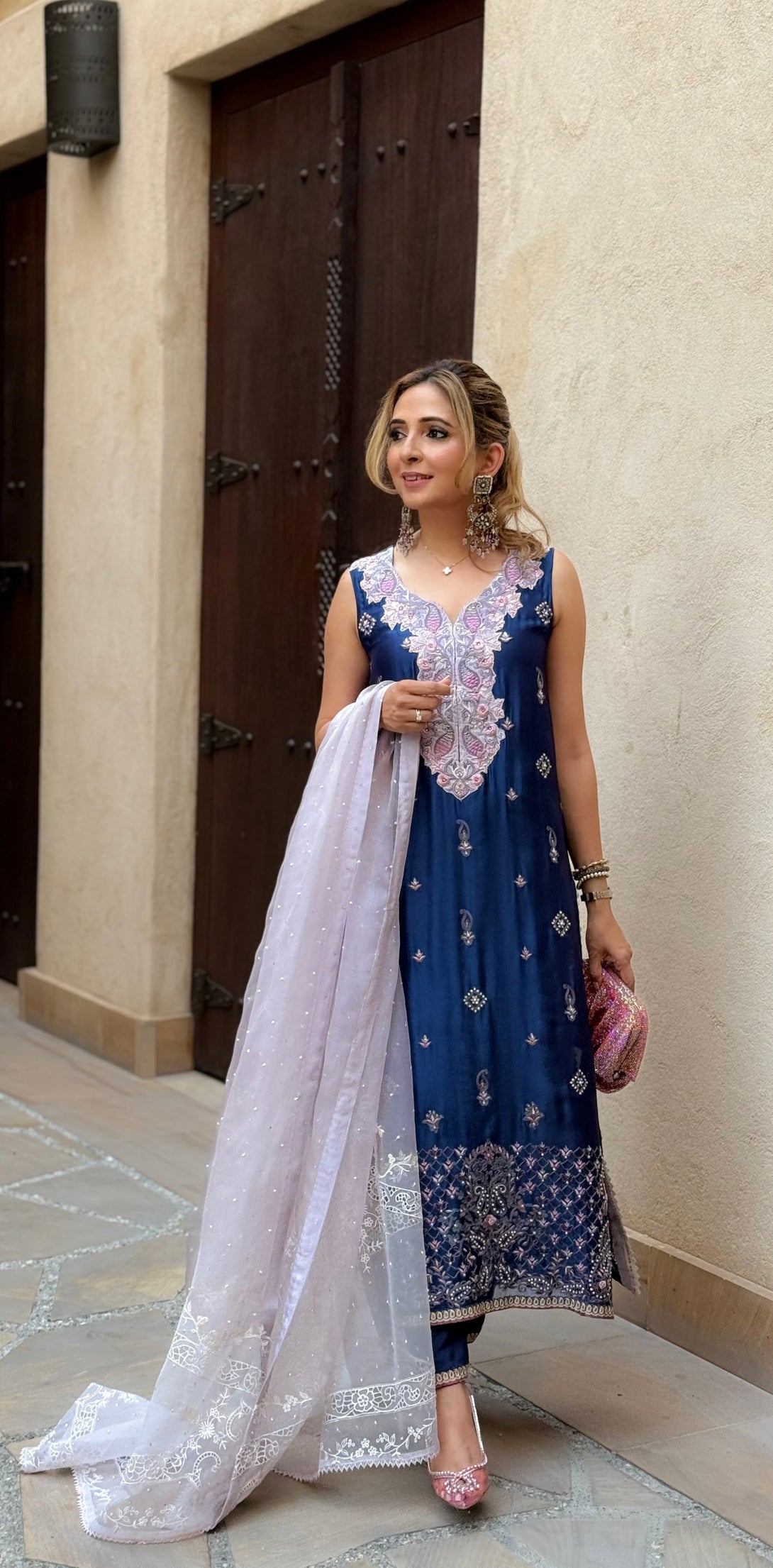 Navy blue silk organza paisley design aari work long shirt with lavender hand embroidered accents, navy blue viscose silk pants with border.