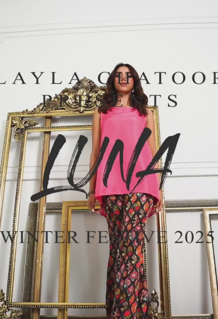 Bold, playful, and effortlessly chic — Lydia is a standout pret wear ensemble designed for the modern woman who isn’t afraid to express her style. The fluorescent pink raw silk top, cut in a structured boxy silhouette, delivers instant impact, while the delicate pleated detailing at the back adds a graceful twist that moves beautifully as you do. The minimal front meets an unexpected back, giving this top its own personality.