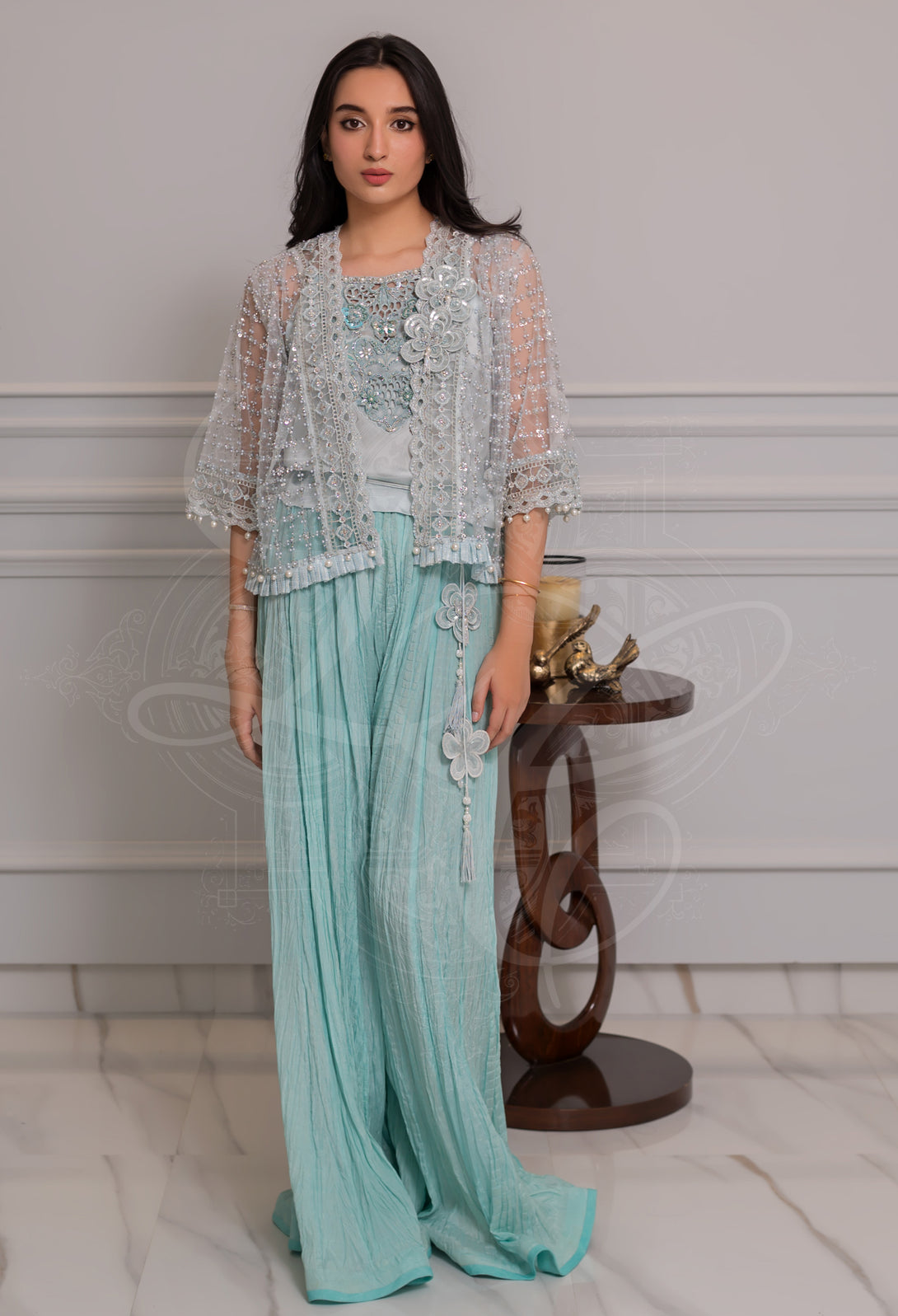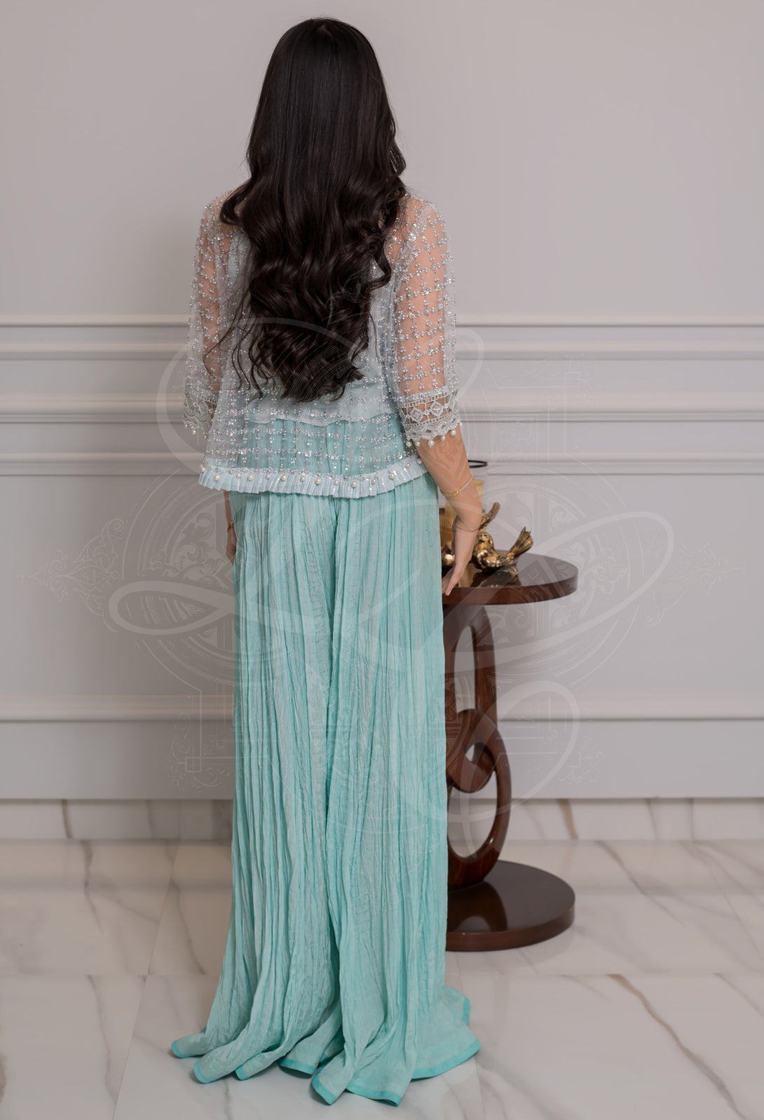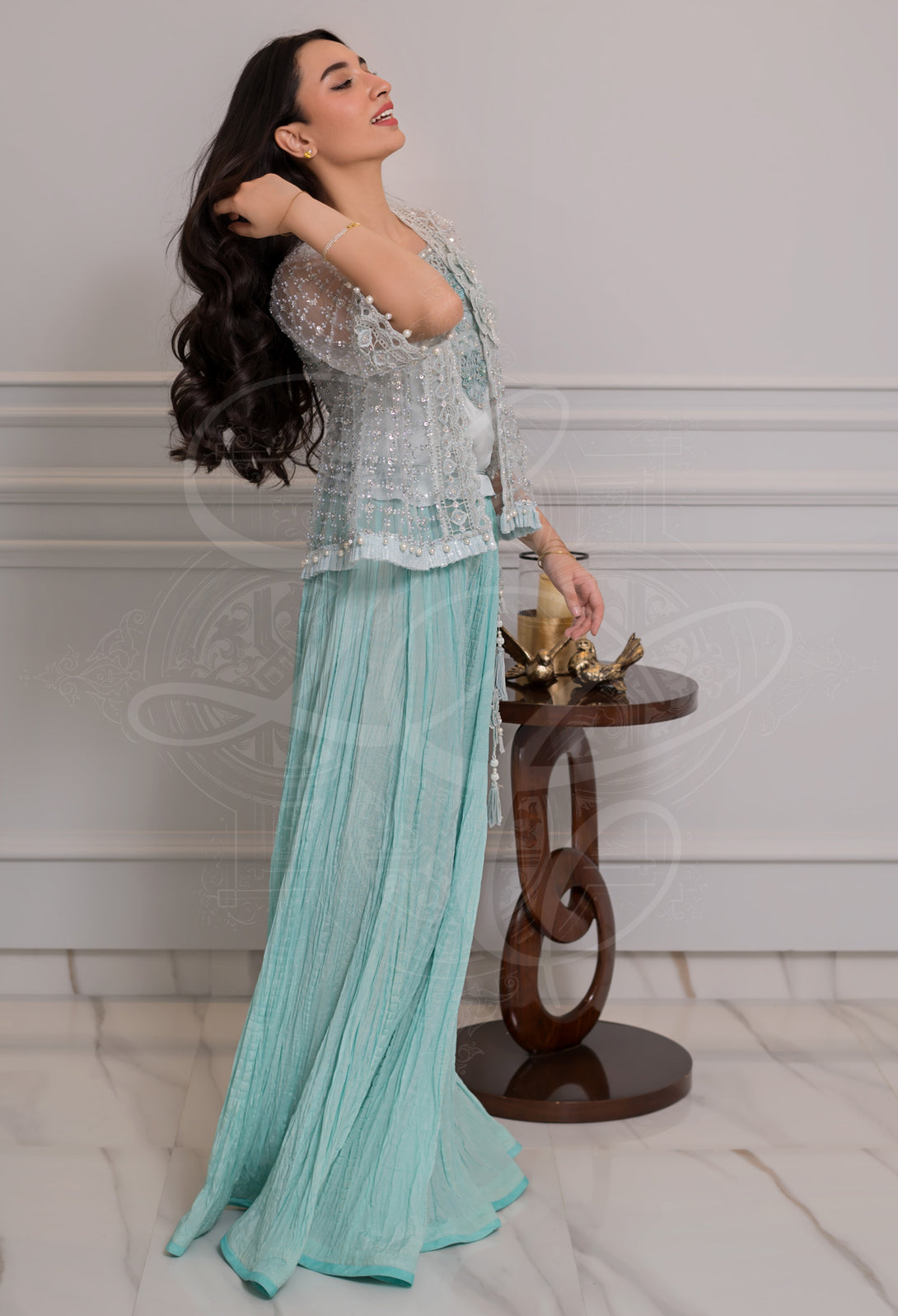 Introducing the Noor Aqua Green Gharara Set—a contemporary expression of elegance and femininity. This stunning ensemble features a short aqua green organza coat adorned with intricate 3D embroidery and embellishments, layered over a delicately worked camisole. Paired with soft crushed gharara pants that offer effortless movement and a sculpted 3D embellished belt for a defined waistline, this look is perfect for day-to-evening festive wear, intimate weddings, or formal celebrations. Light, fresh, and luxuriously detailed—Noor captures modern glamour with a touch of tradition.