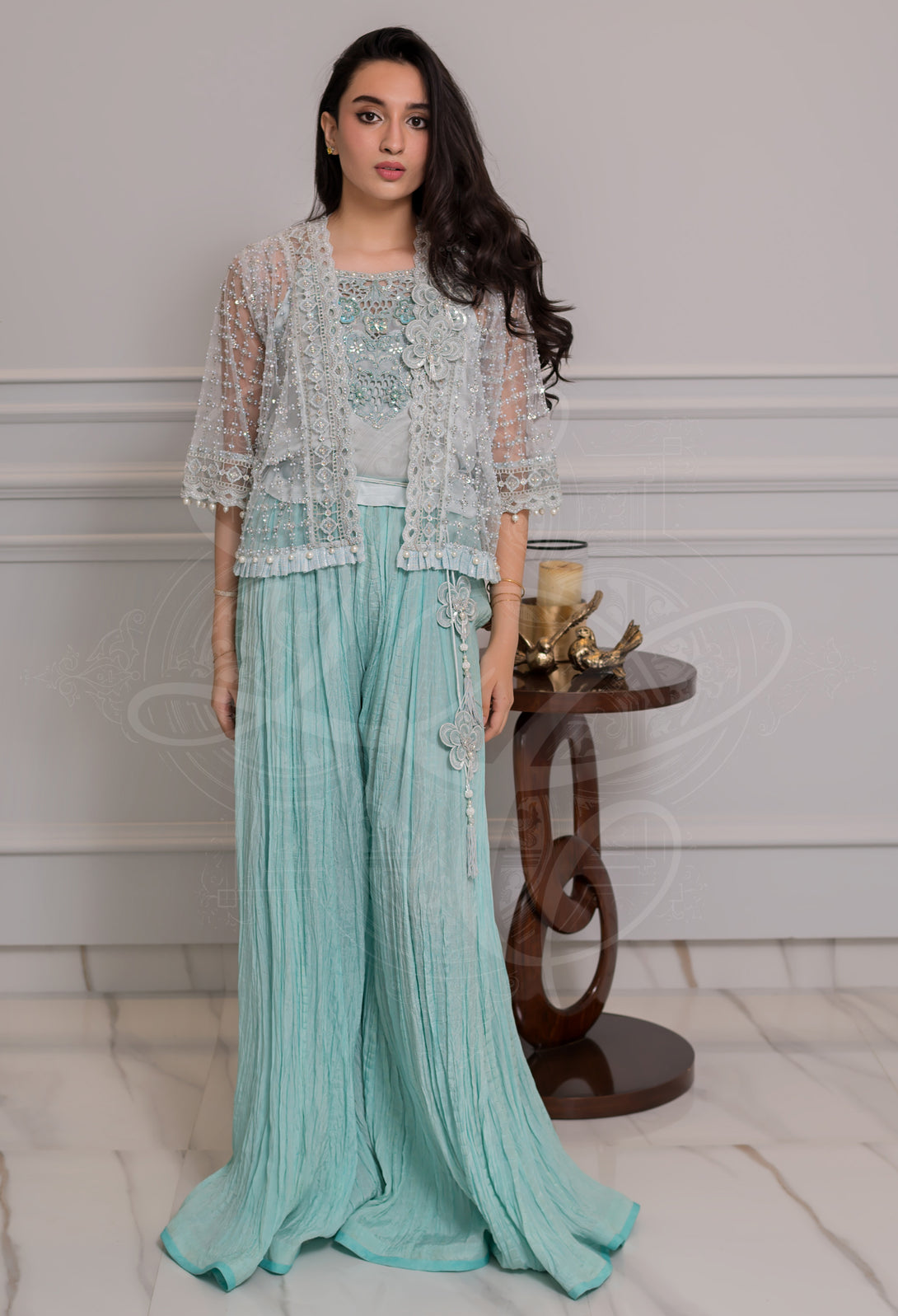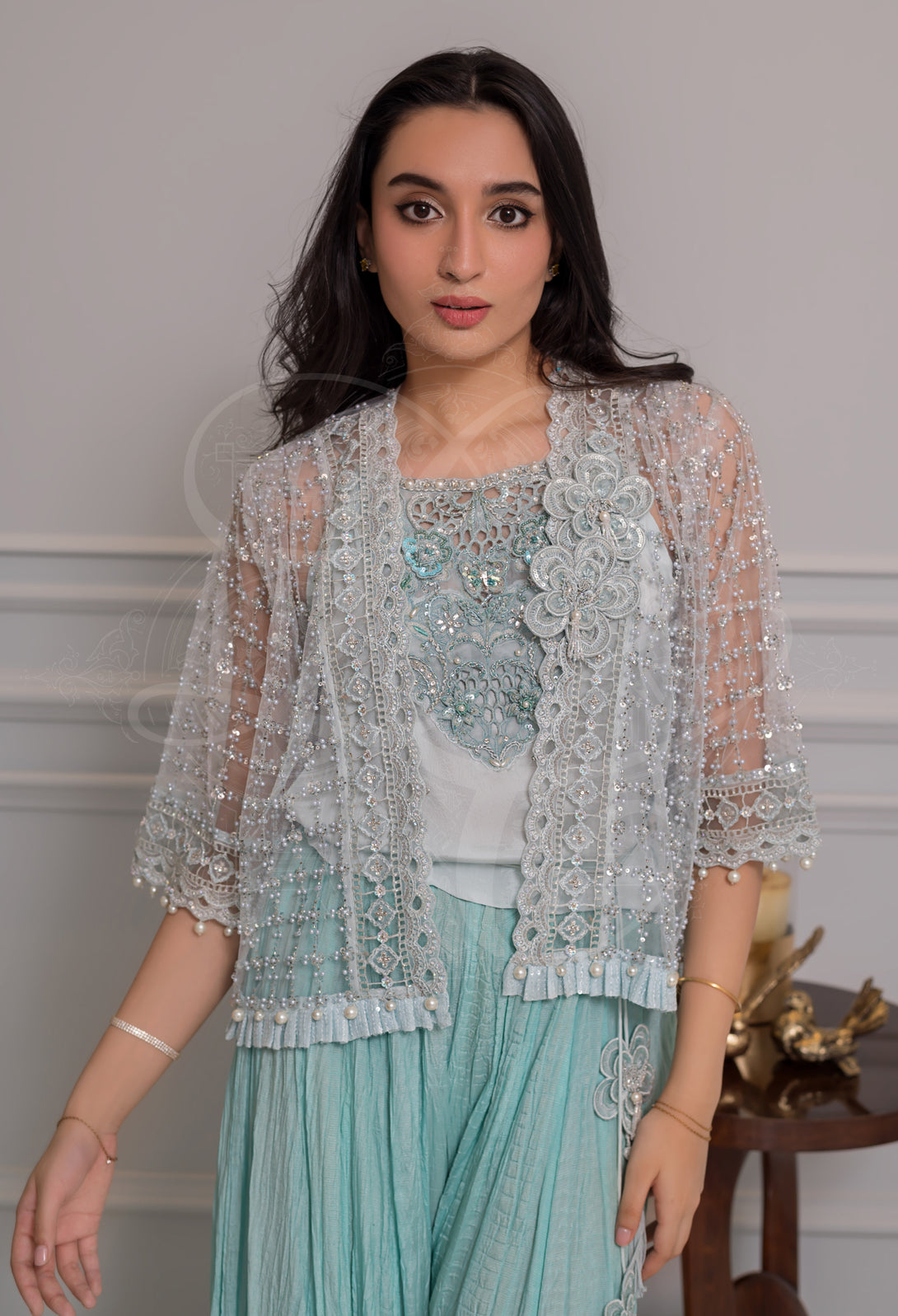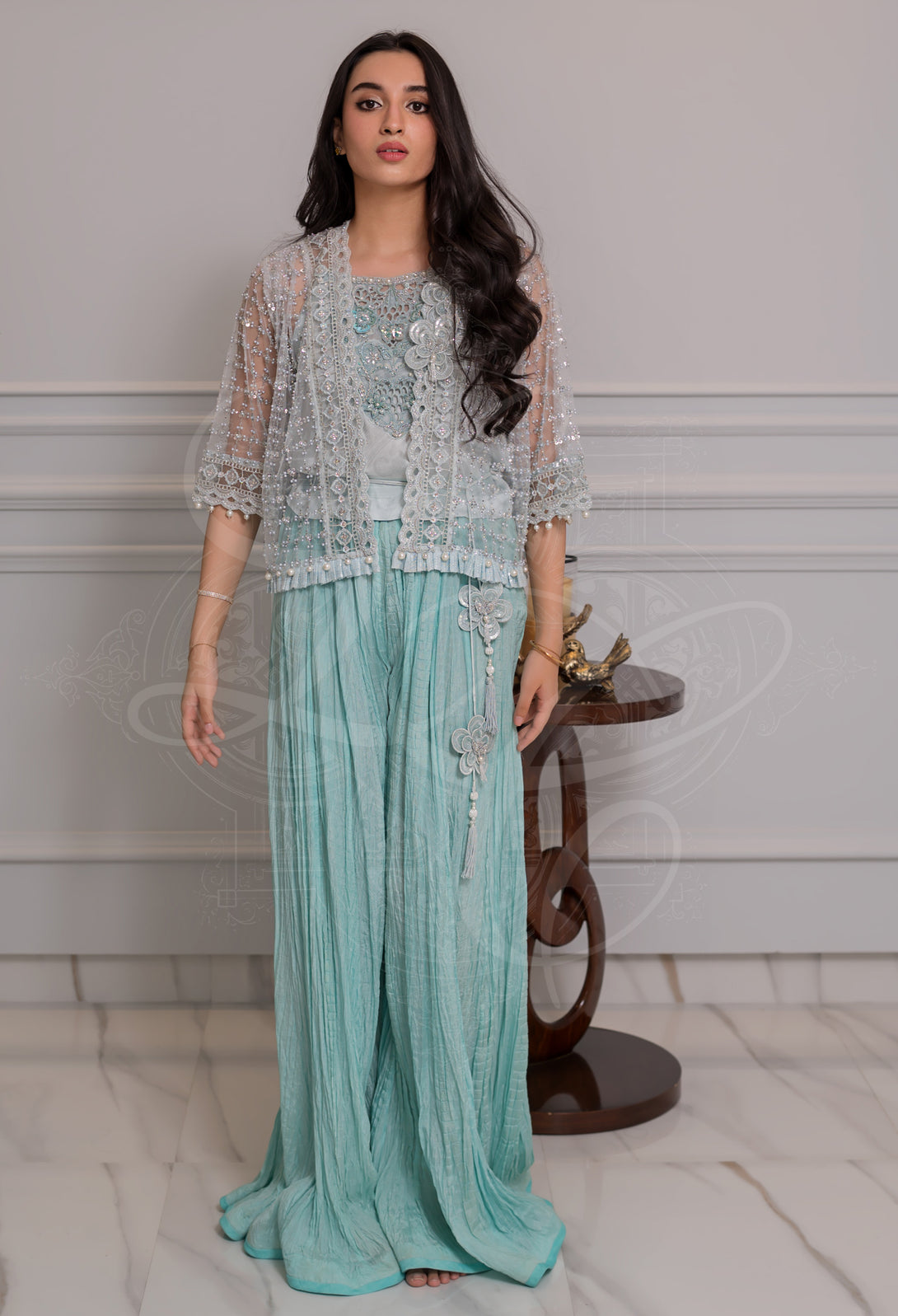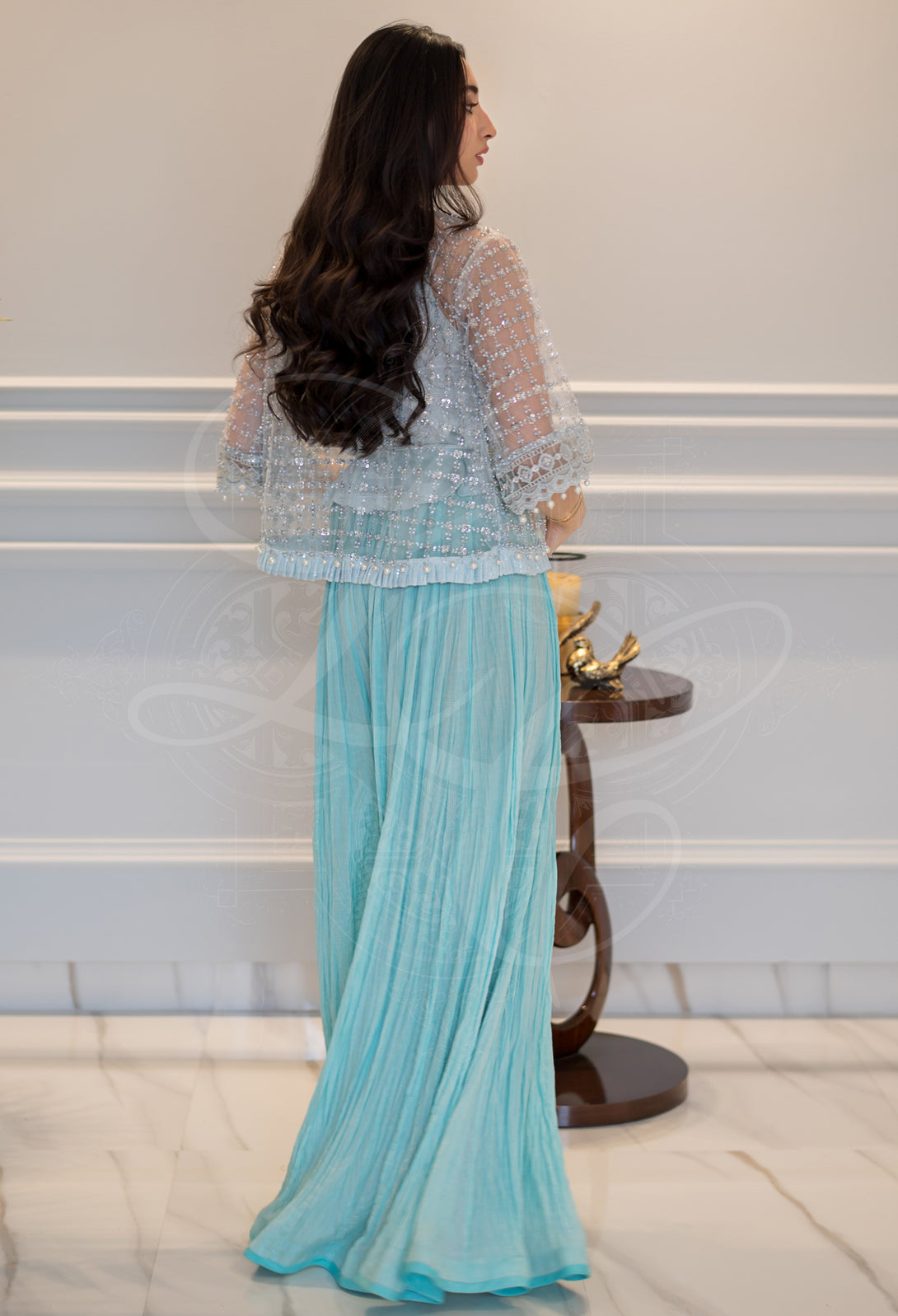 Introducing the Noor Aqua Green Gharara Set—a contemporary expression of elegance and femininity. This stunning ensemble features a short aqua green organza coat adorned with intricate 3D embroidery and embellishments, layered over a delicately worked camisole. Paired with soft crushed gharara pants that offer effortless movement and a sculpted 3D embellished belt for a defined waistline, this look is perfect for day-to-evening festive wear, intimate weddings, or formal celebrations. Light, fresh, and luxuriously detailed—Noor captures modern glamour with a touch of tradition.