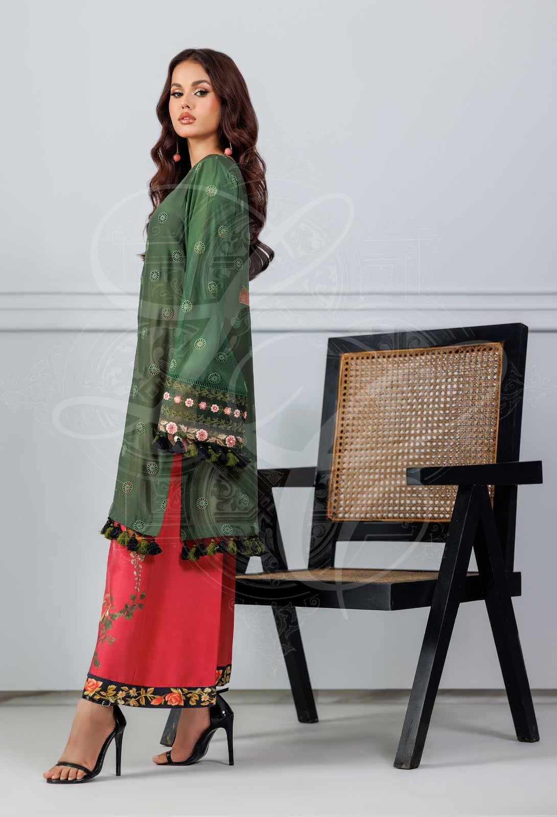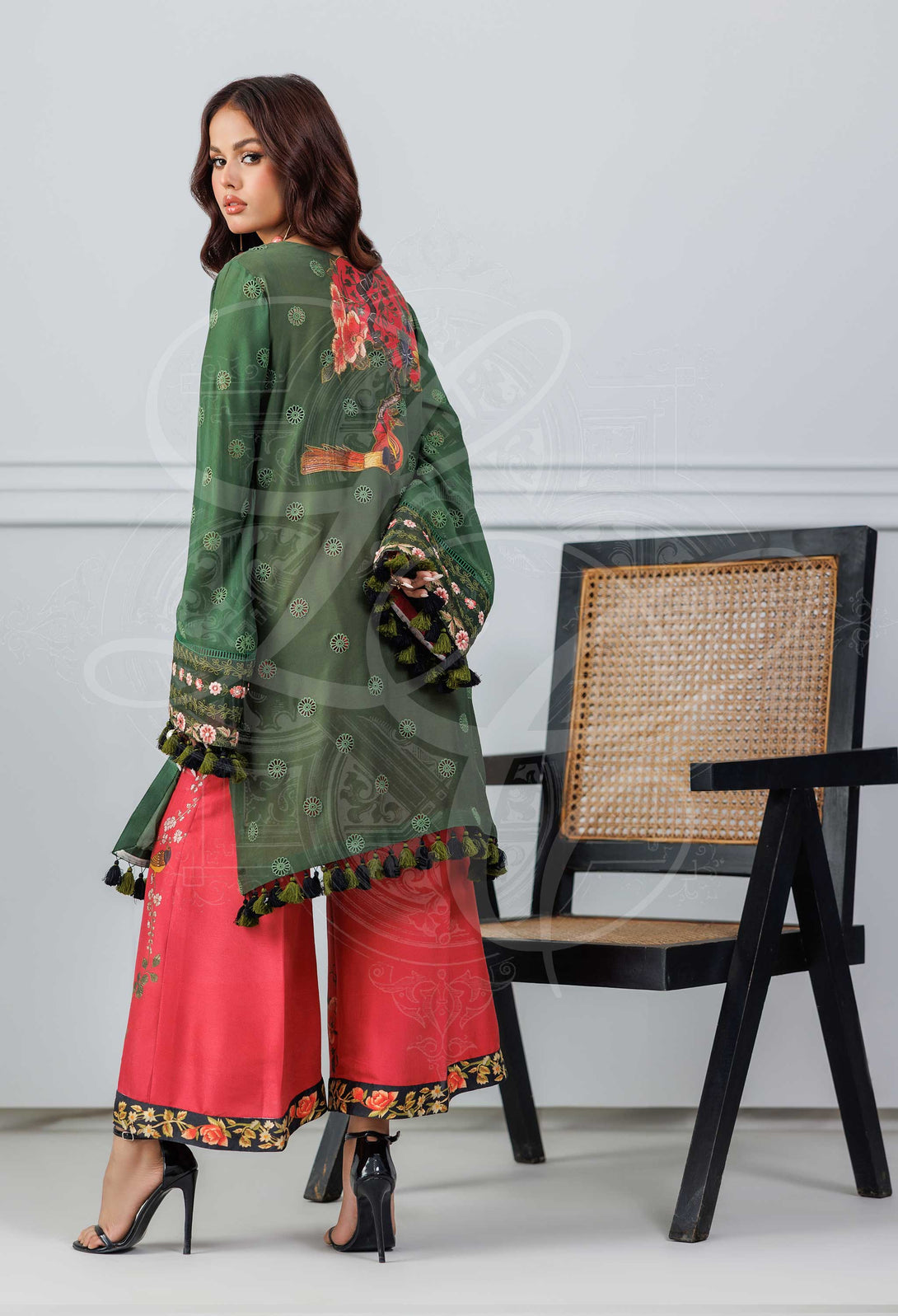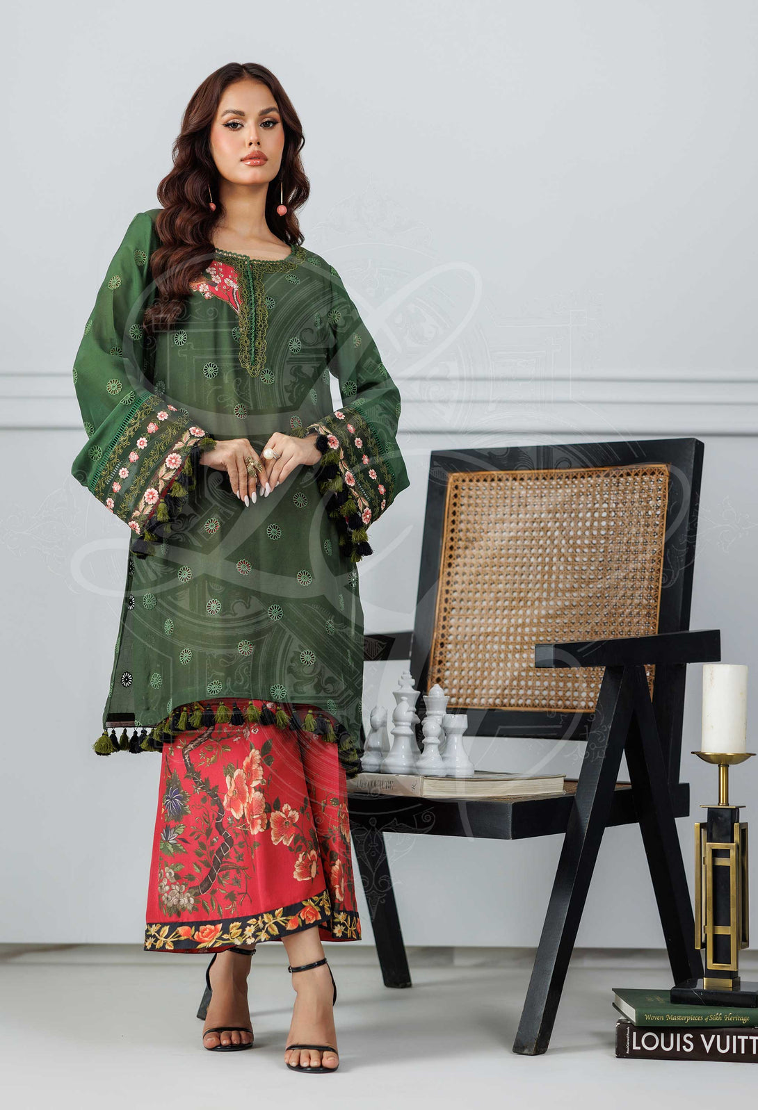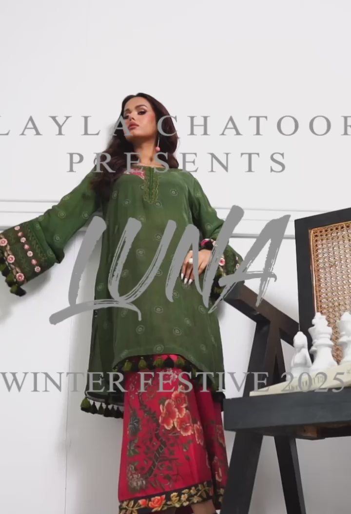 Infused with energy and charm, Fayra is a spirited take on contemporary pret wear, offering a fresh silhouette with bold personality. The olive green short-style shirt is adorned with delicate floral motifs and finished with whimsical tassels that bring a playful touch to the hemline. Its standout feature—dramatic bell sleeves—are beautifully embroidered with a mix of vibrant and soft tones, adding texture and movement.