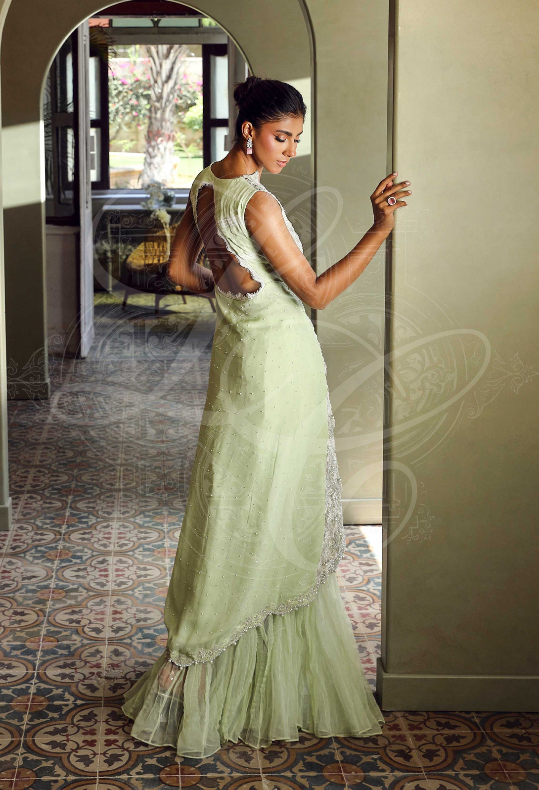 Kiya – Pistachio Hi-Lo Front-Open Top with Crushed Organza Lehenga