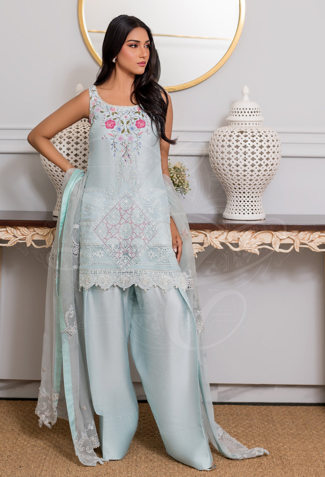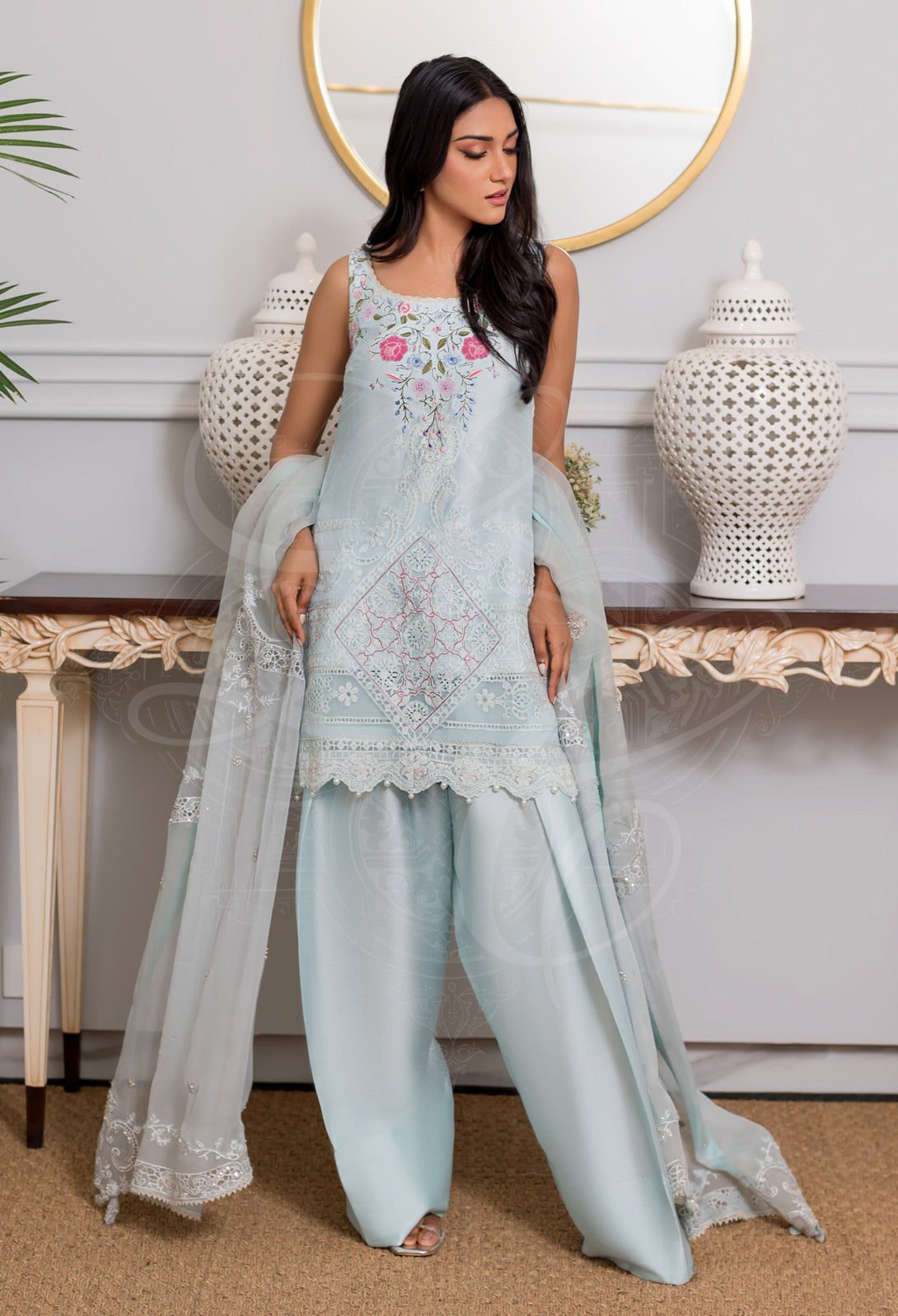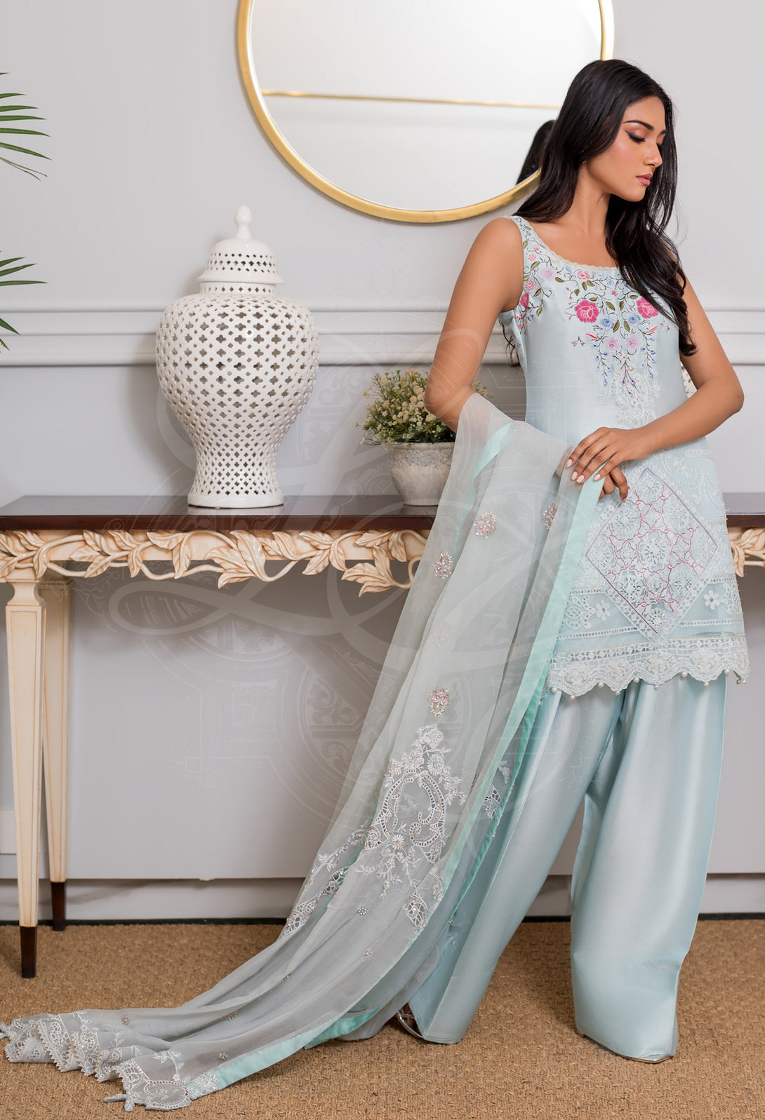 Sky Blue Aari Cutwork Set With Farshi Shalwar And Gota Dupatta