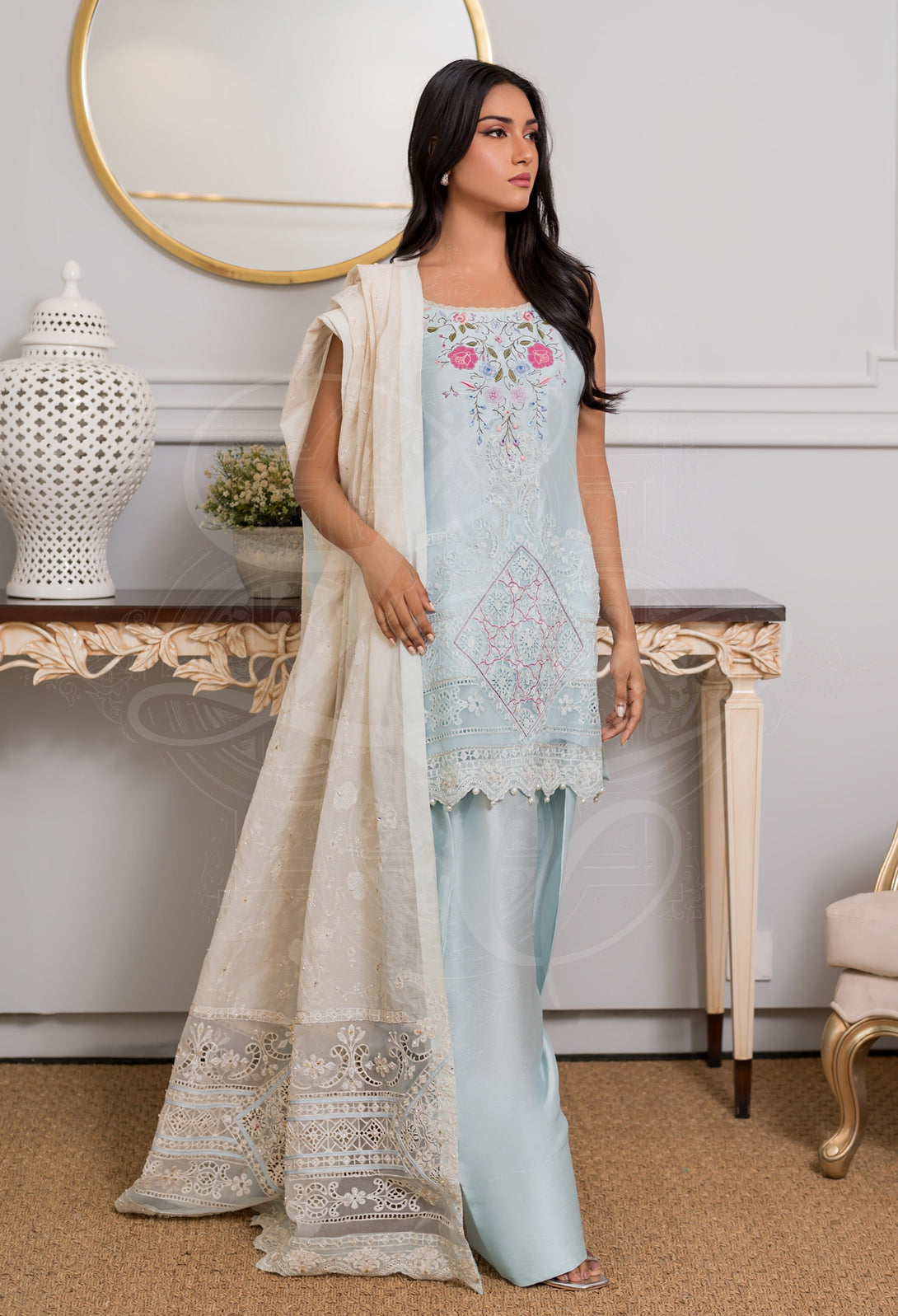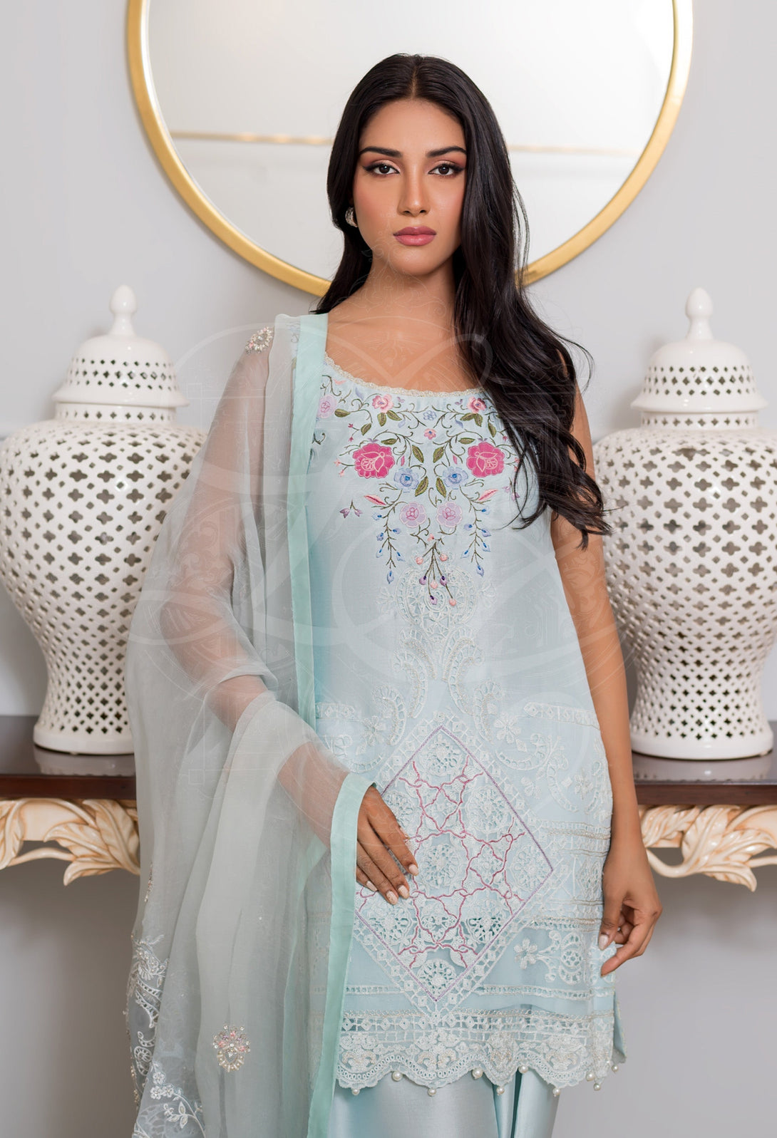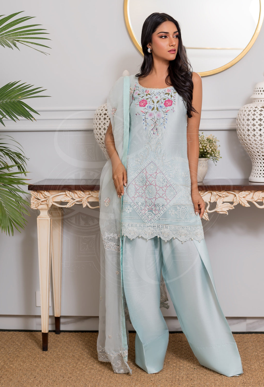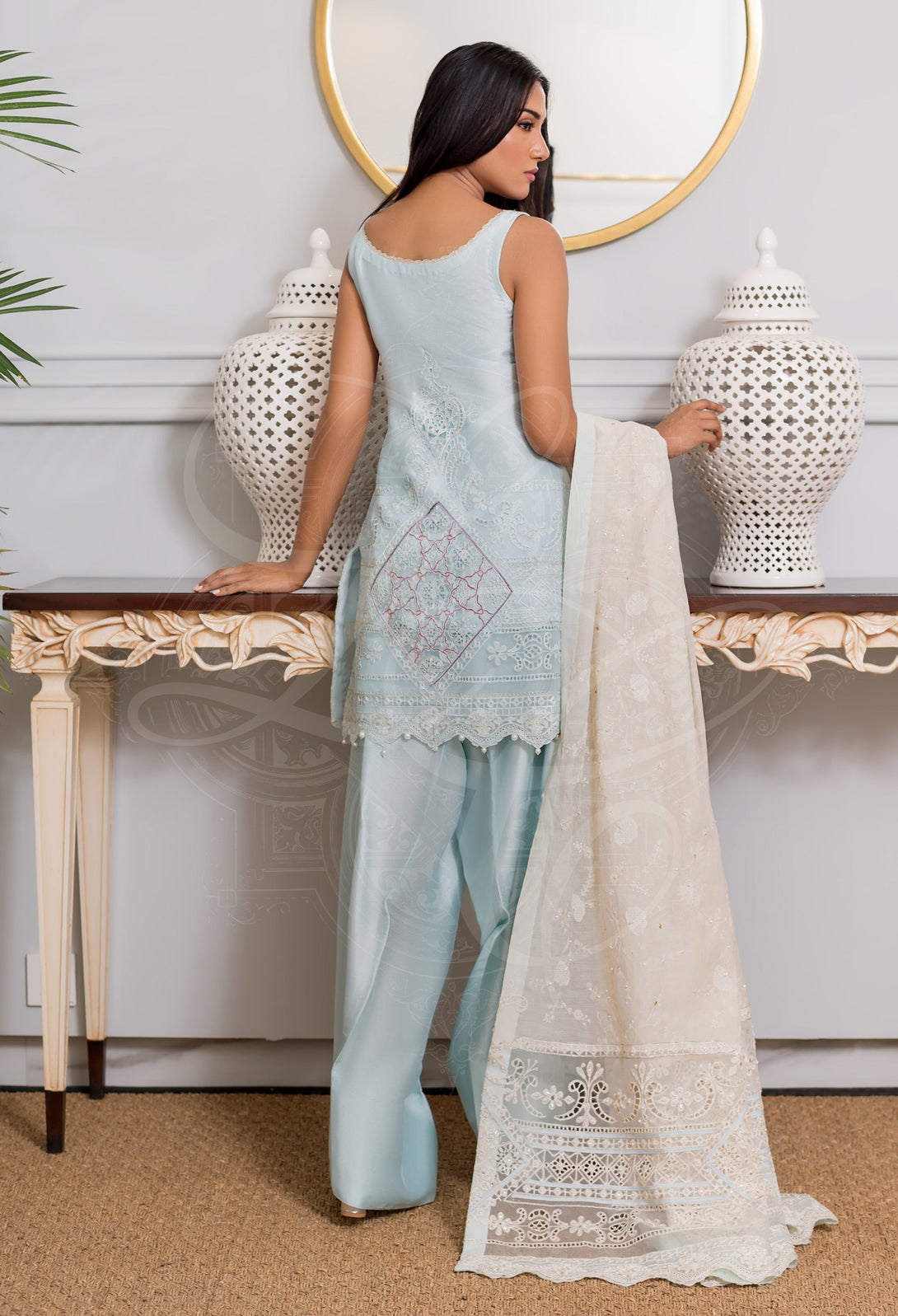 Sky Blue Aari Cutwork Set With Farshi Shalwar And Gota Dupatta