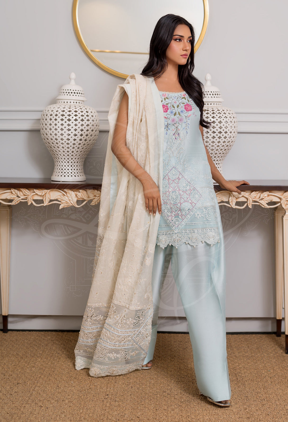 Step into timeless grace with this powder blue short tunic, exquisitely adorned with hand-done aari and cutwork floral detailing. Paired with a flowing Farshi shalwar, the ensemble exudes refined femininity and heritage charm. The look is completed with a statement dupatta featuring intricate jaal embroidery and traditional gota work — a versatile, heirloom-inspired piece offered in two exquisite options to suit your preference.