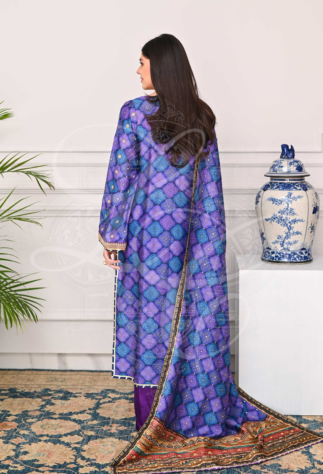 The outfit is paired with luxurious silk palazzo pants, providing a flattering, fluid silhouette that complements the overall design. A signature printed silk dupatta, finished with bold contrasting borders and detailed embellishments, completes the ensemble with a touch of refined artistry. Freesia Grace radiates understated glamour, making it the perfect choice for upscale occasions and festive celebrations.