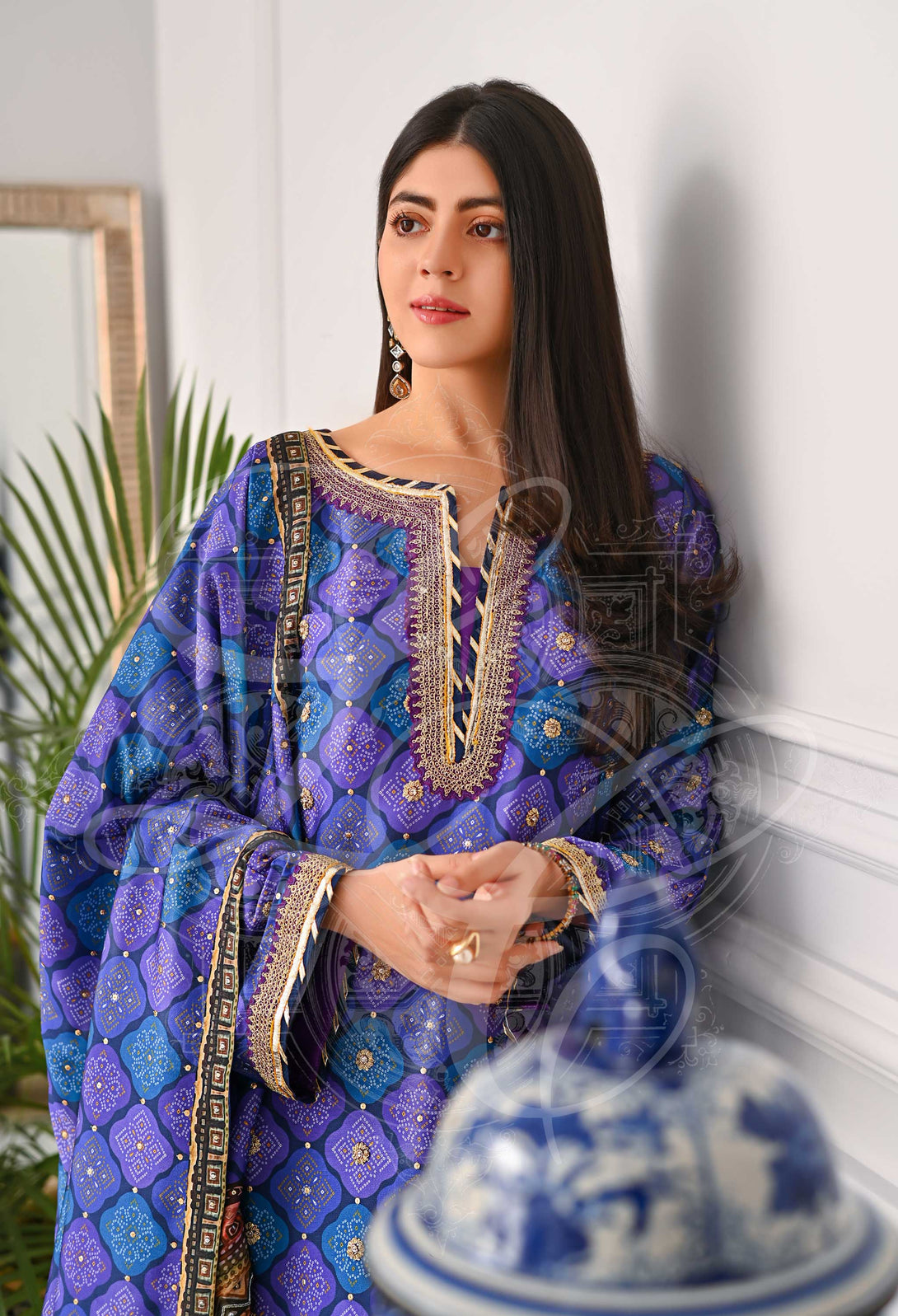 Freesia Grace is a sophisticated indigo purple pret wear ensemble, effortlessly merging classic design with modern elegance. The long kurta features a stunning floral chunri-inspired print, with vibrant colors and intricate contrasts that exude timeless beauty. The gold-embellished neckline enhances the ensemble's regal appeal, while the airy bell sleeves, adorned with delicate gold accents, introduce a soft, graceful movement.