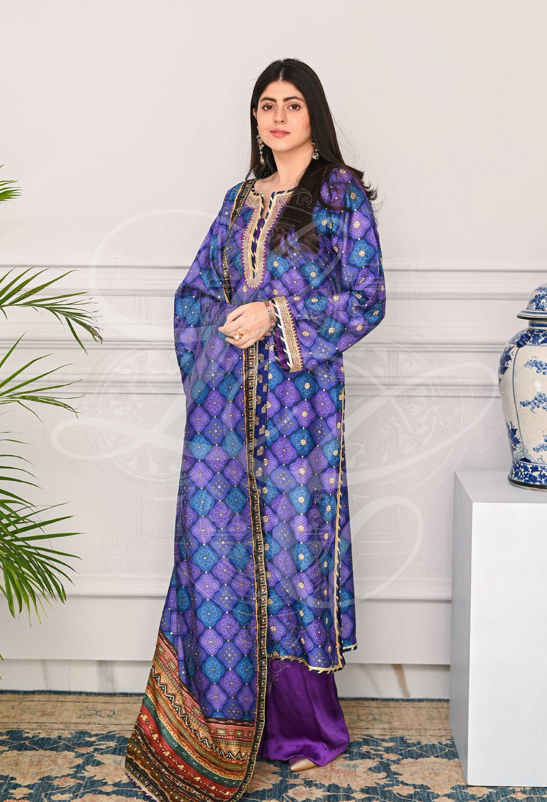 Freesia Grace is a sophisticated indigo purple pret wear ensemble, effortlessly merging classic design with modern elegance. The long kurta features a stunning floral chunri-inspired print, with vibrant colors and intricate contrasts that exude timeless beauty. The gold-embellished neckline enhances the ensemble's regal appeal, while the airy bell sleeves, adorned with delicate gold accents, introduce a soft, graceful movement.