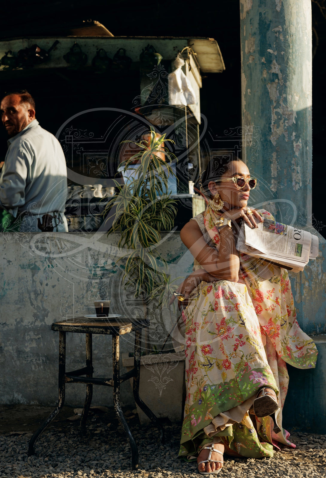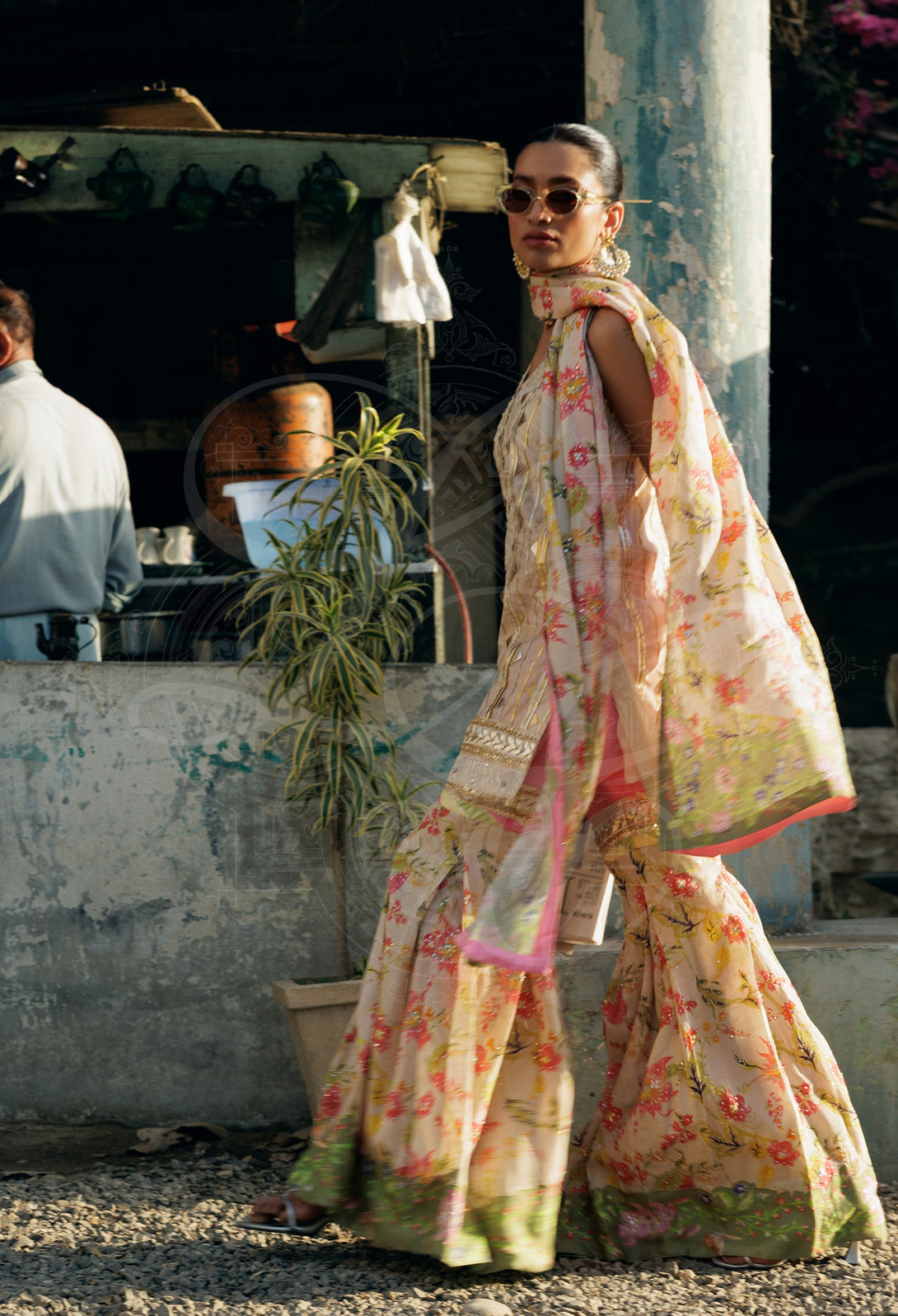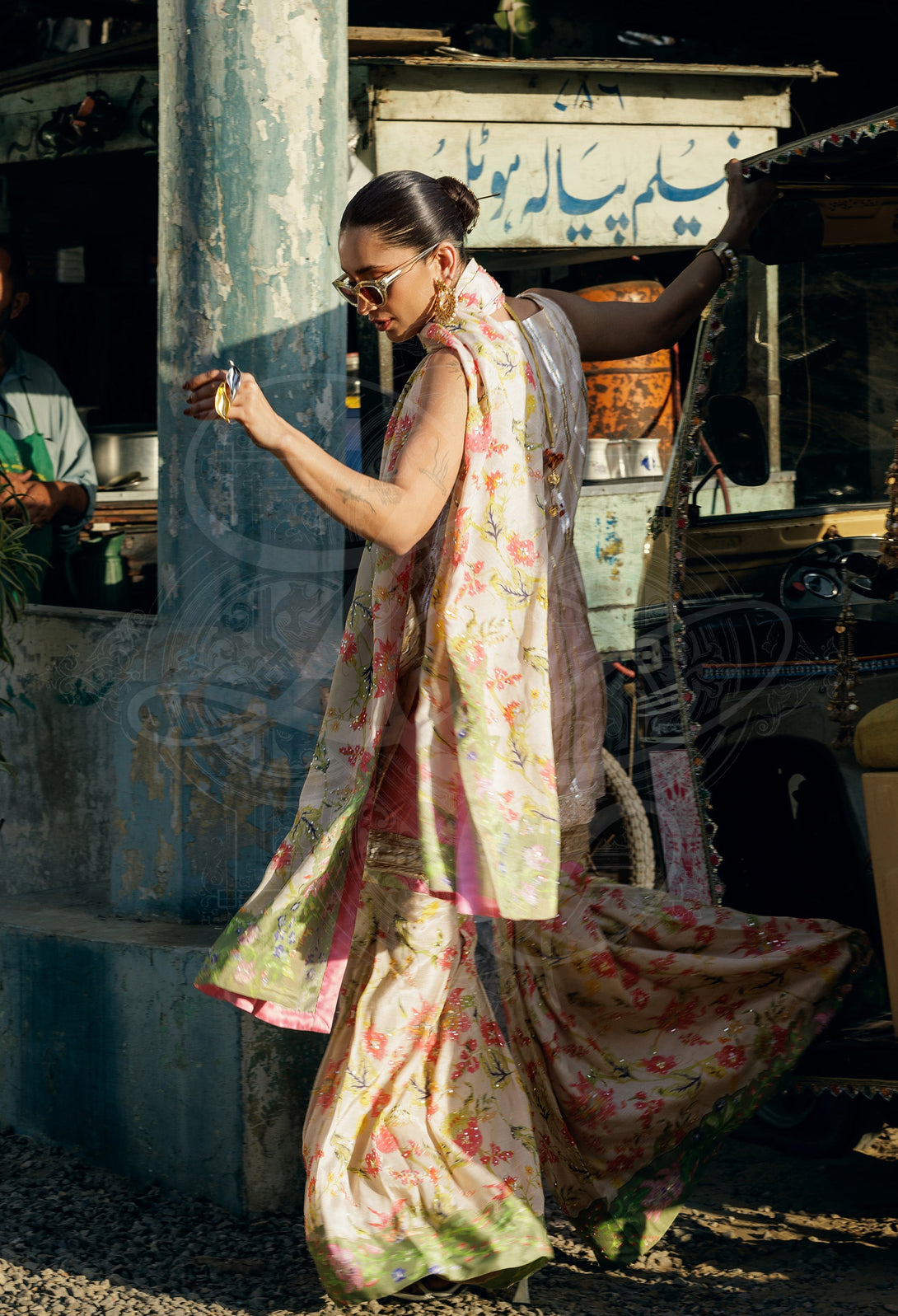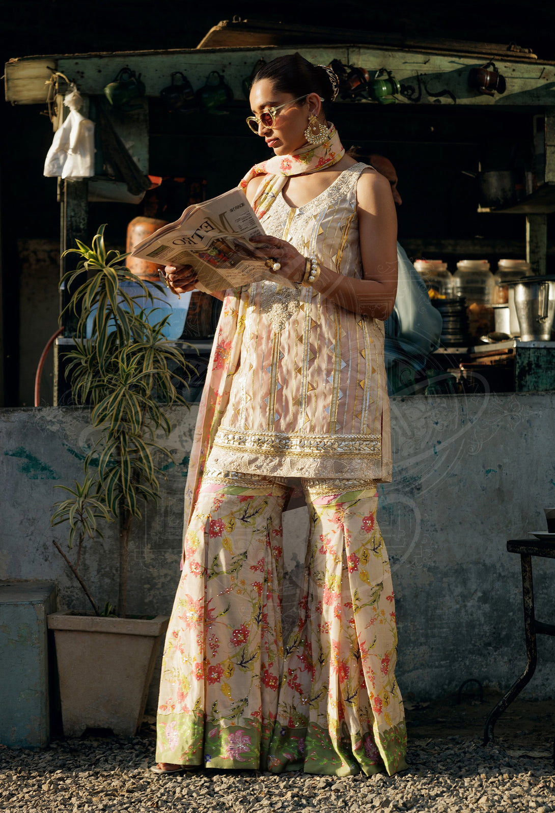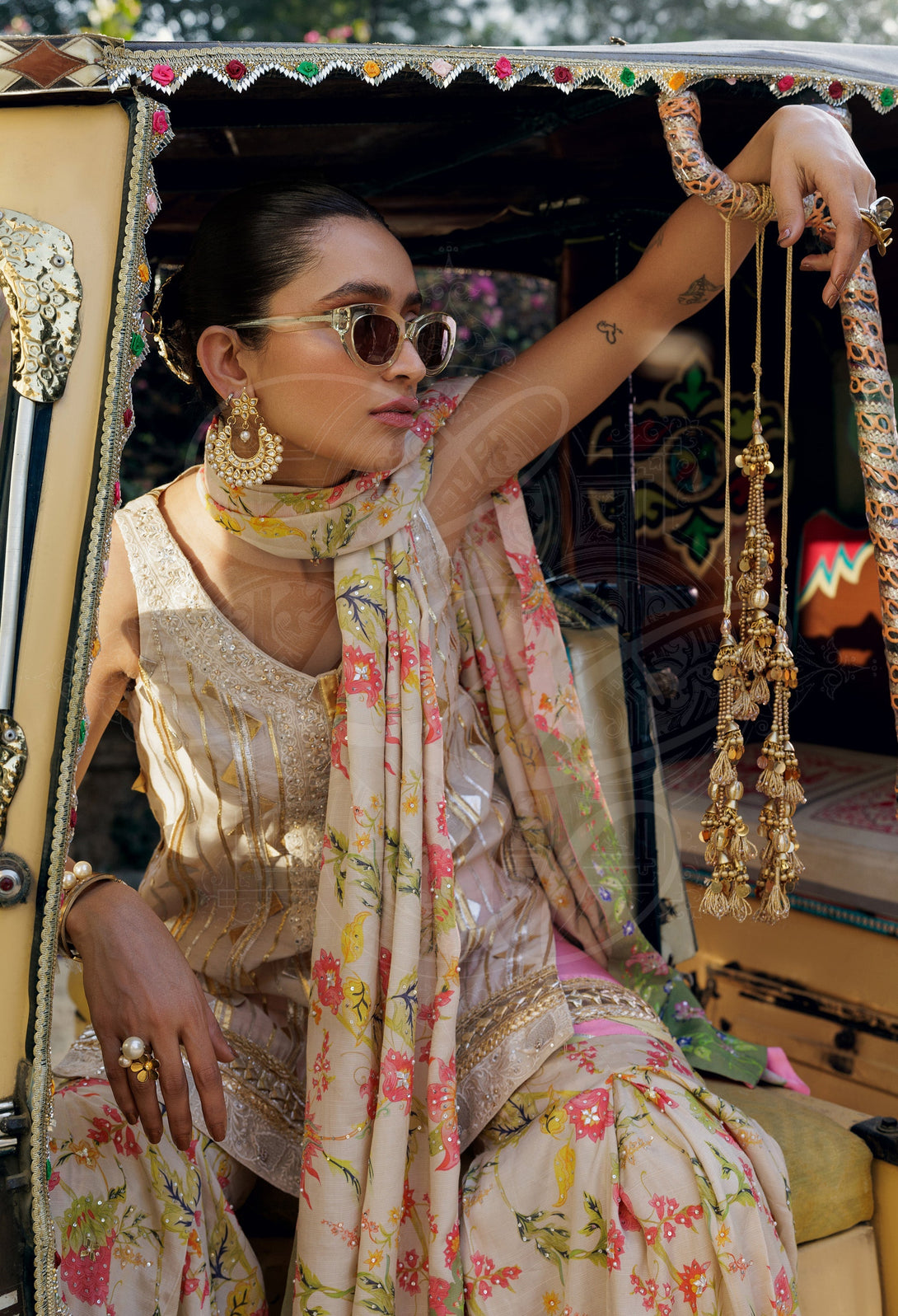 Elevate your festive wardrobe with the Layla Chatoor "RAYA" Luxe Gharara Set, a statement ensemble that blends modern elegance with traditional craftsmanship. This designer outfit features a contemporary striped shirt adorned with an intricate Chikankari neckline, paired beautifully with an embellished gharara for timeless flair. The look is completed with a heavily embellished printed dupatta.