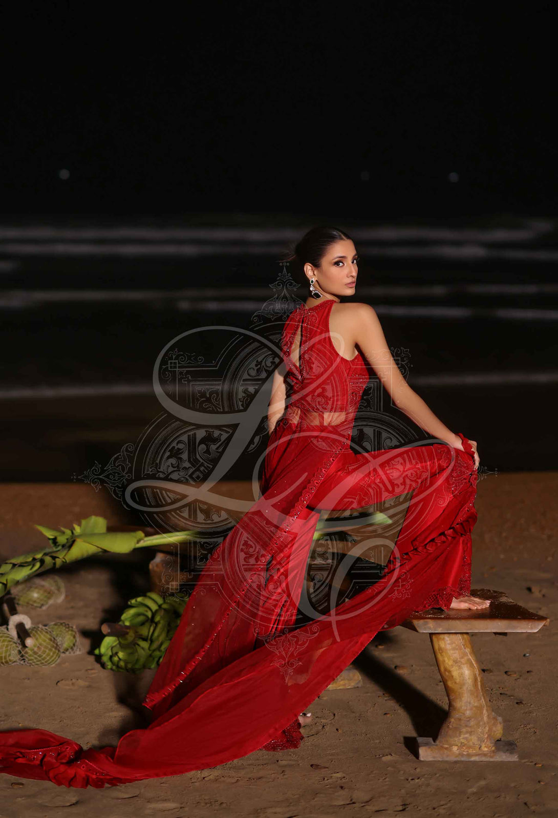 Red Embellished Draped Top With Bootcut Pants
