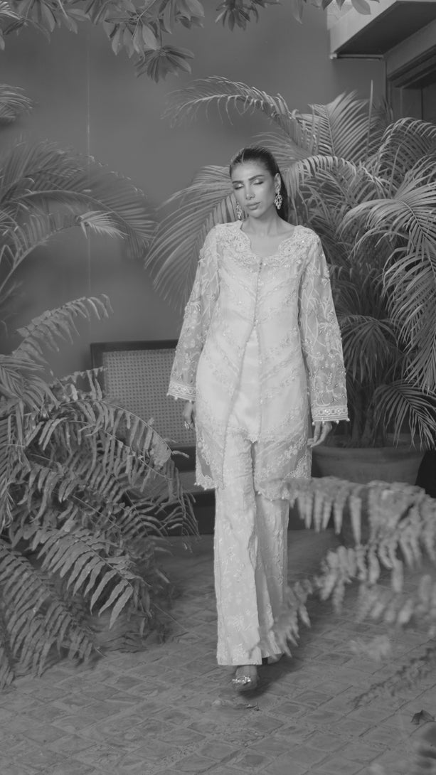 Powder blue landscape embroidered coat with 3D flowers and butterflies, Kaamdaani front paired with a camisole and self embroidered flared pants
