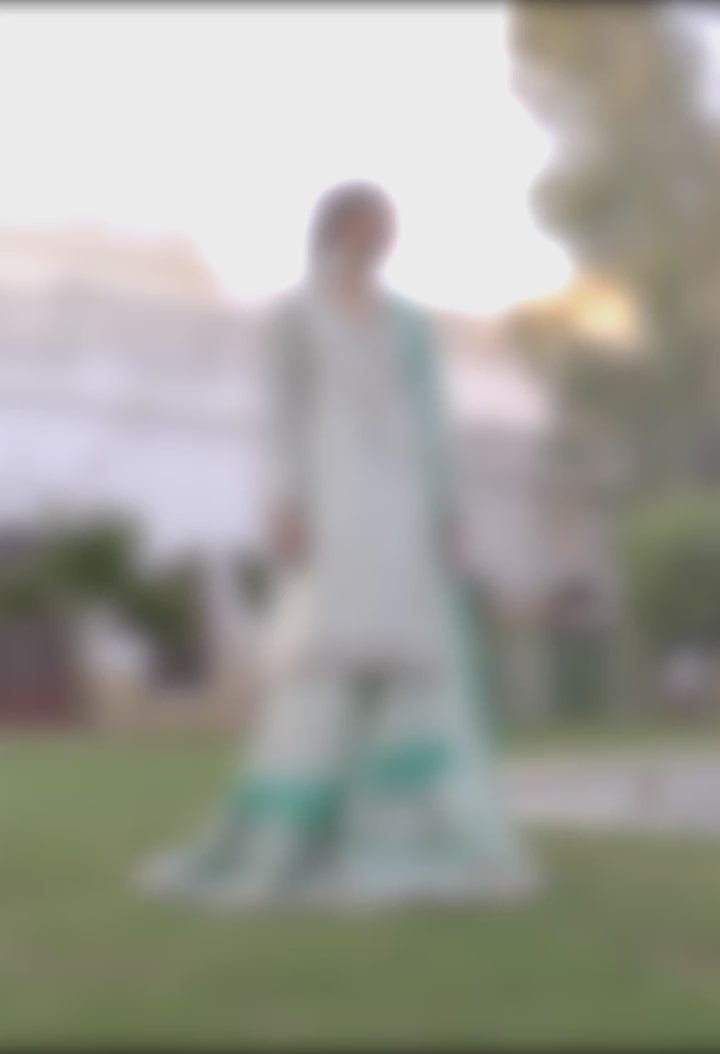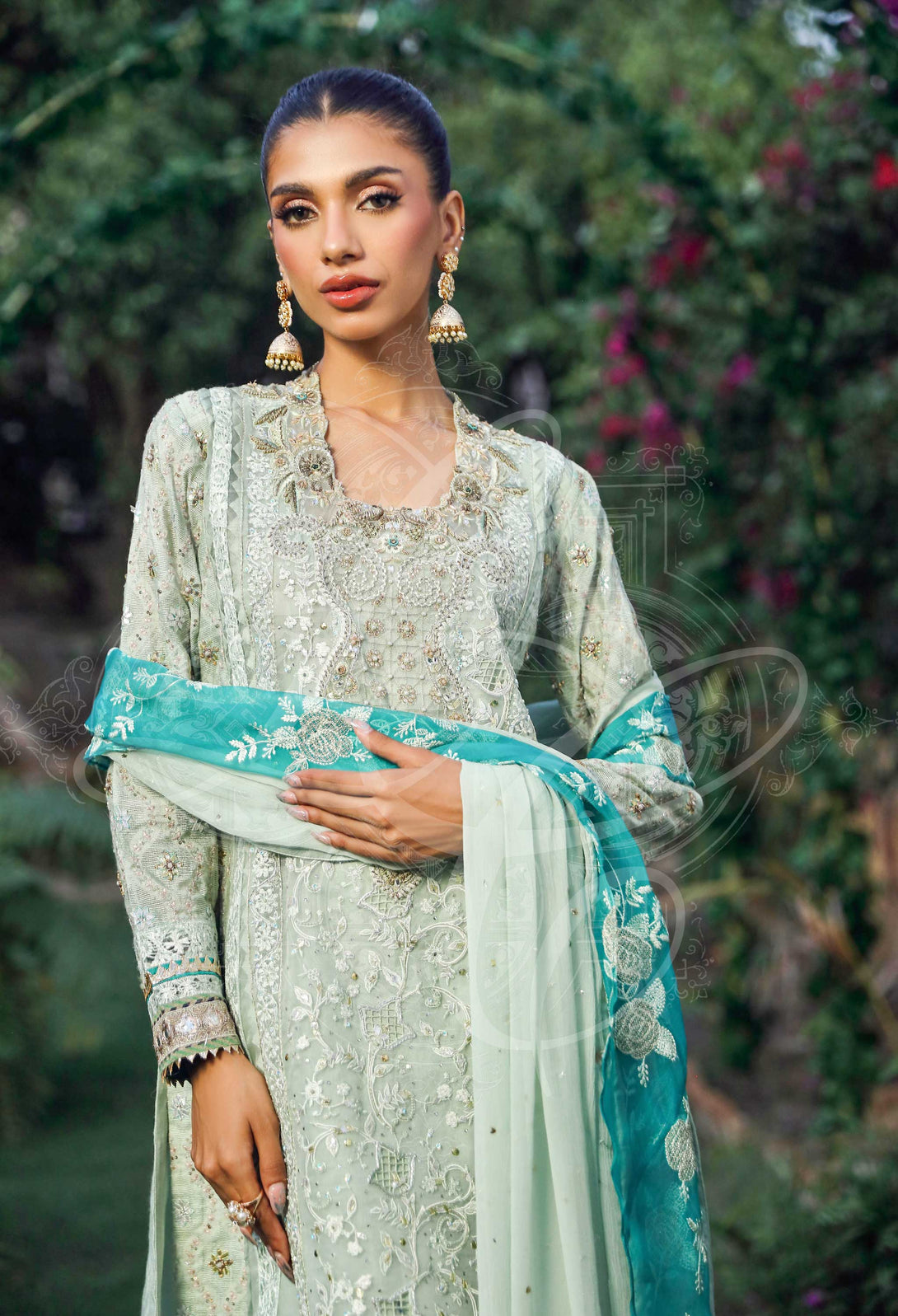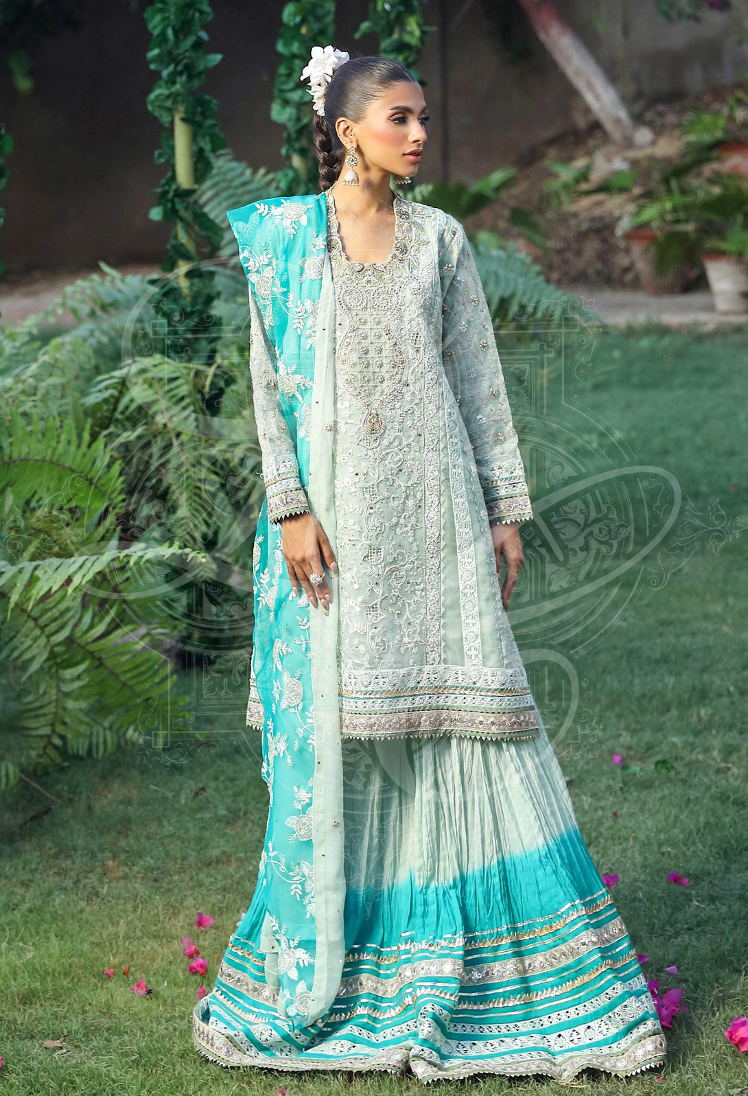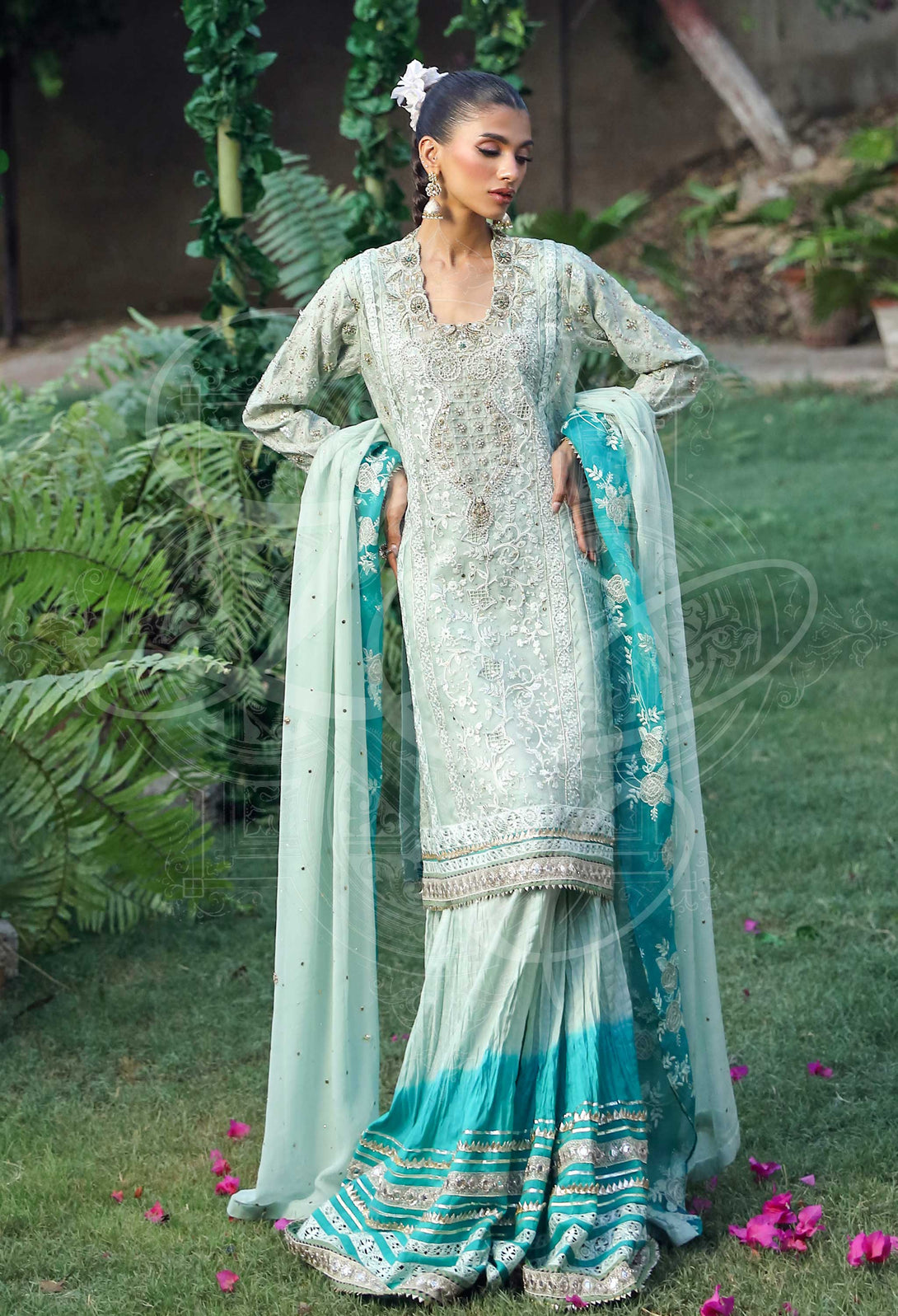 The ensemble is paired with a textured crushed gharara, adorned with traditional tarkashi craftsmanship and sparkling mirror highlights, delivering a timeless and festive charm. Completing the look is a flowing ruffled dupatta in a matching sage tone, artistically adorned with delicate floral appliqué, adding a layer of femininity and flair to this elevated luxury pret outfit.