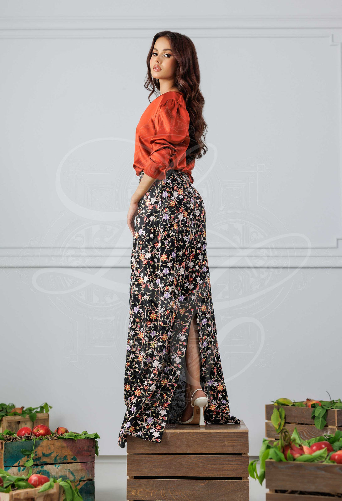 The look is paired with a rich auburn blouse, crafted in lustrous charmeuse silk, designed to contrast beautifully against the darker tones of the skirt. The sleek structure of the top balances the skirt’s flair, creating a youthful yet polished outfit perfect for festive gatherings, creative soirées, or stylish day-to-evening transitions.