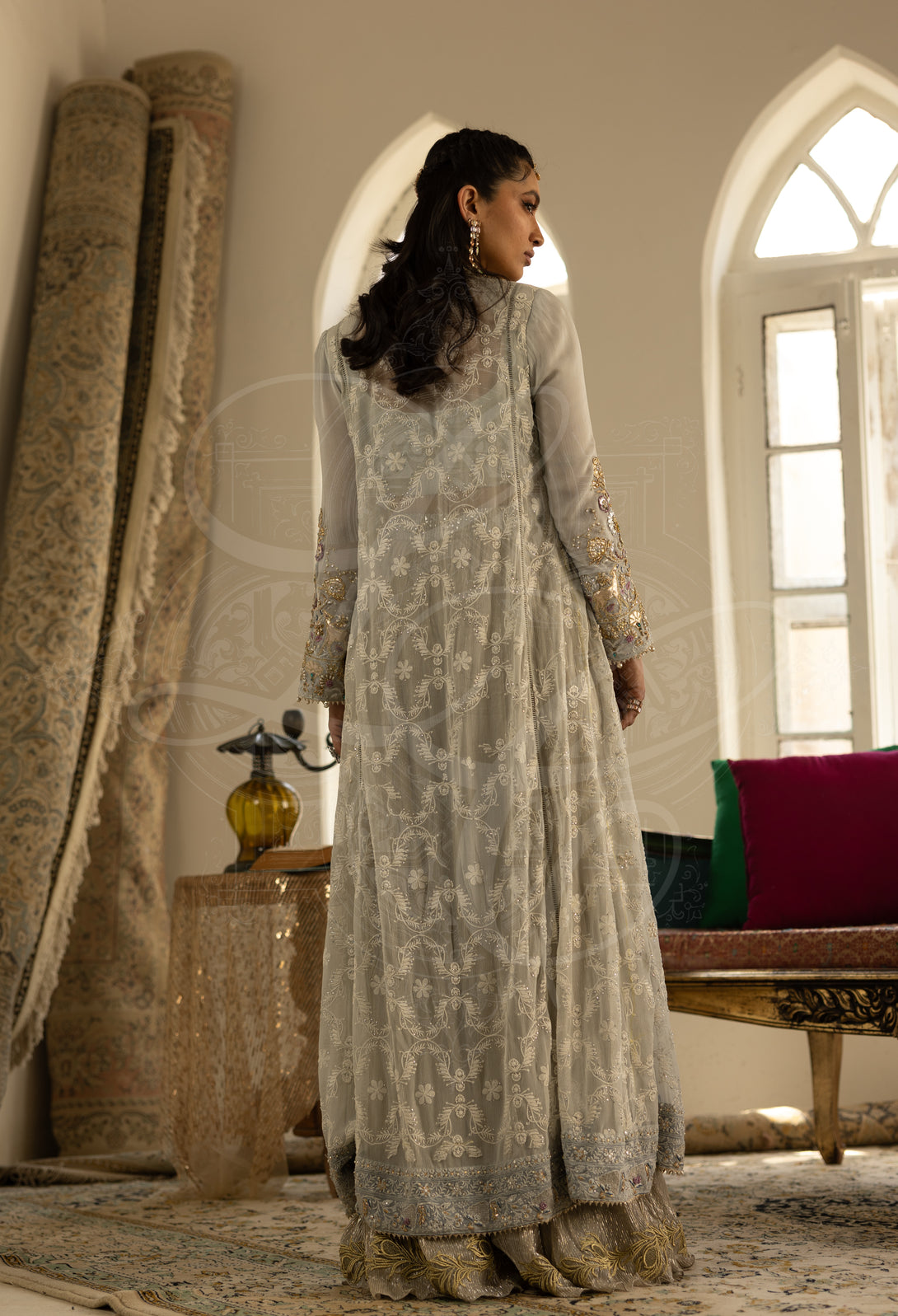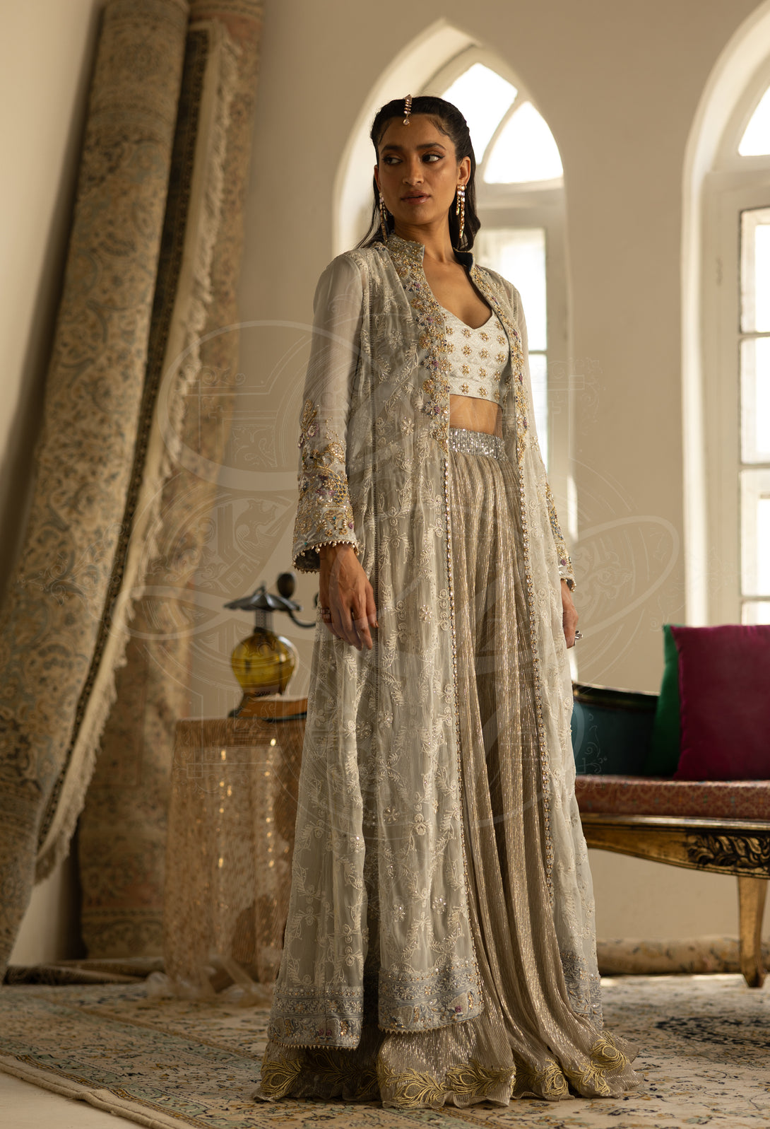 Silver Grey Chikankari Coat Set With Hand Embellished Gharara