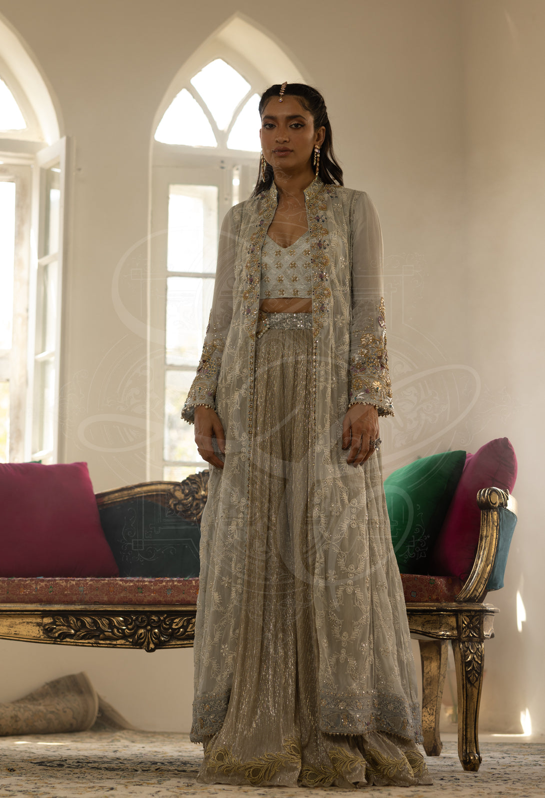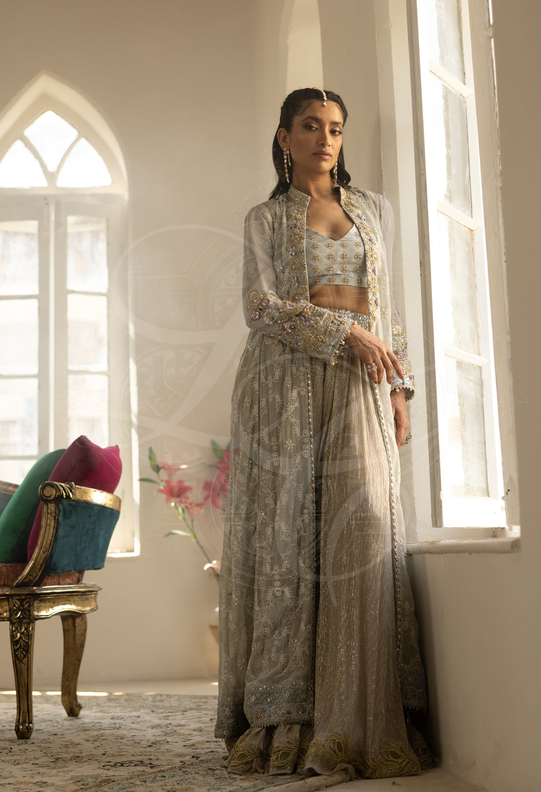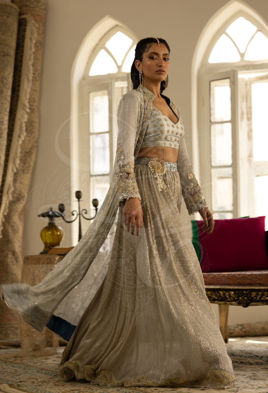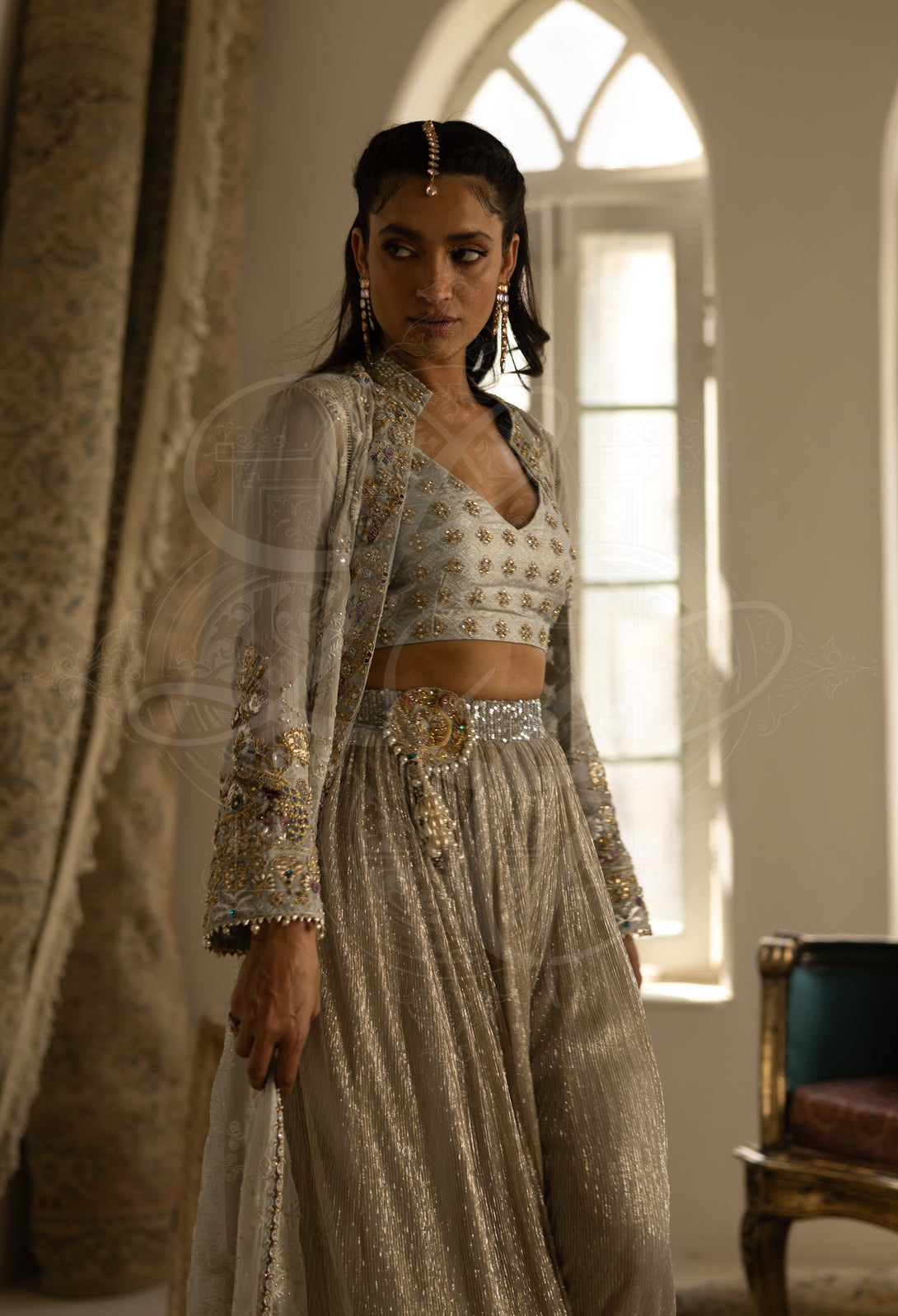 Underneath, a diamanté buti blouse adds shimmer without overpowering, while the lustrous lame gharara anchors the look with graceful movement. A sculpted belt with an embellished motif cinches the waist, adding structure and sophistication to this luxurious statement piece.