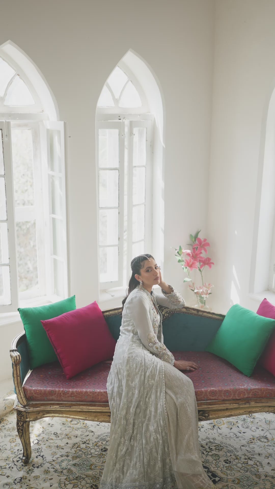 A vision of contemporary elegance grounded in timeless craft, this Silver Grey Chikankari coat set brings together delicate handwork and striking silhouette. The long coat is crafted from Chikankari fabric layered with Kaamdaani and an intricately hand-embellished jaal, finished with a beautifully embroidered border that flows seamlessly across the hem. The neckline and sleeves feature signature landscape embroidery, creating a subtle narrative through thread and texture.