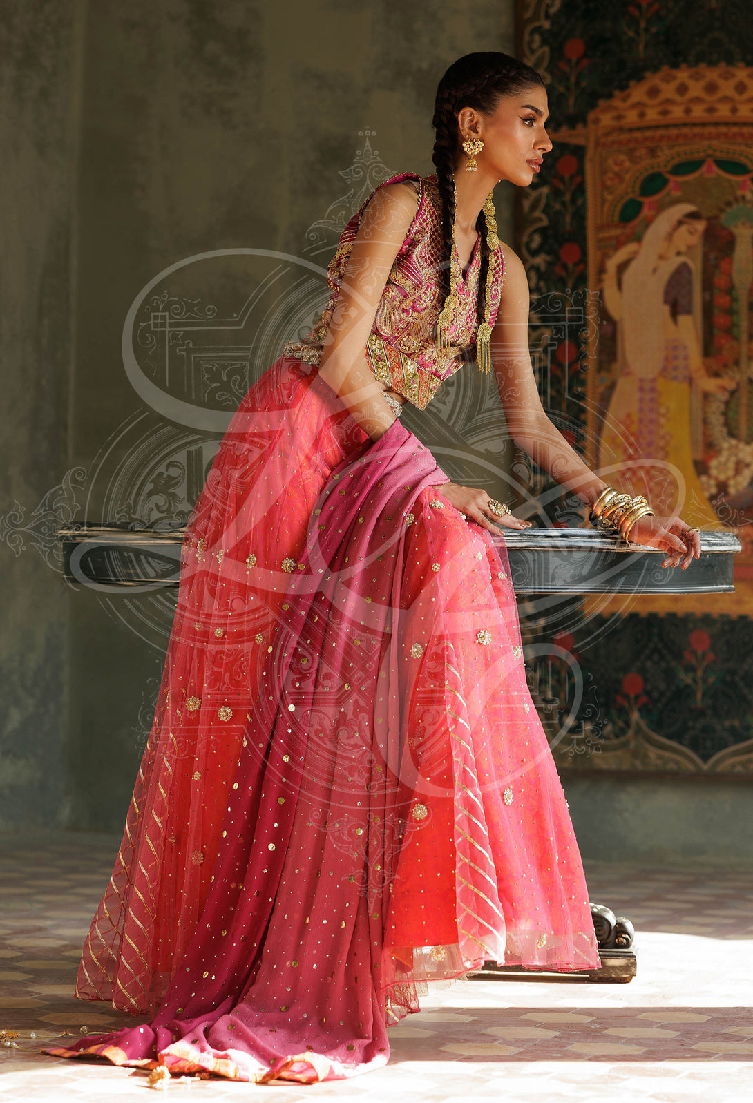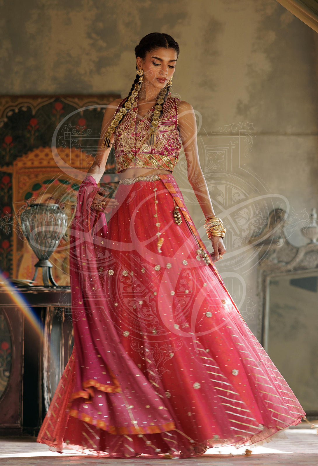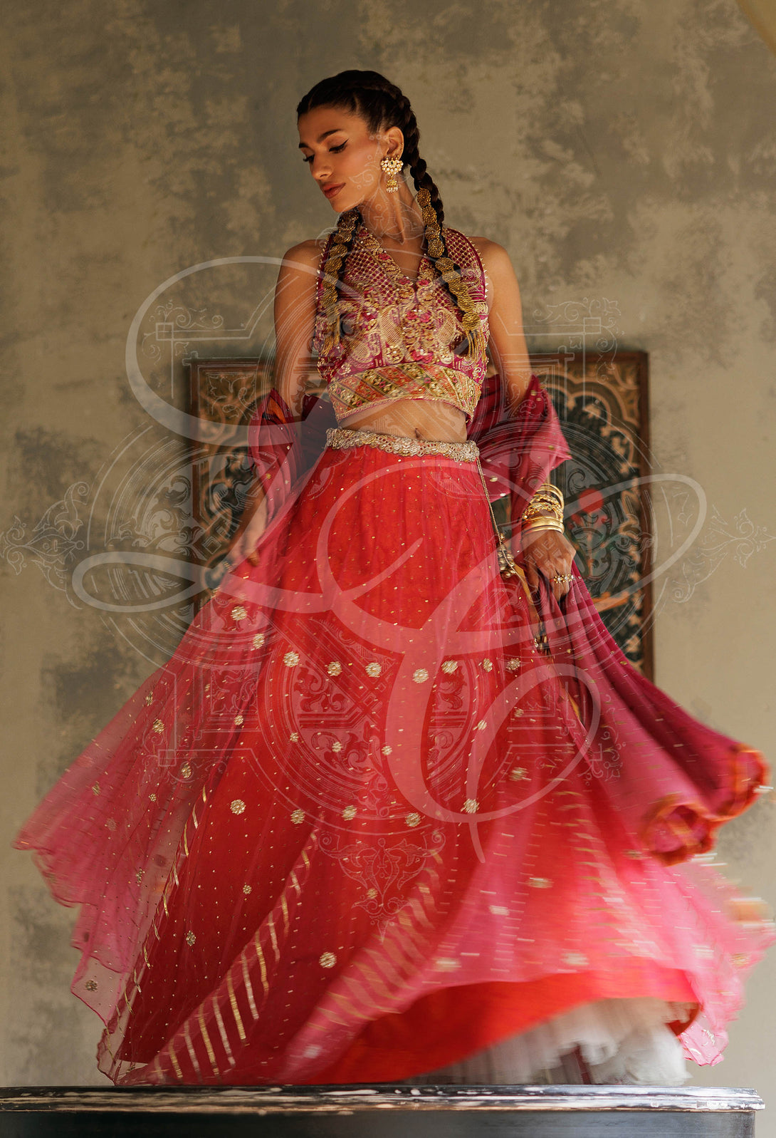 The ensemble is paired with a dramatic, flare-cut lehenga, generously layered and highlighted with gota-adorned panels, creating a striking, movement-filled silhouette. Completing the outfit is a kaamdani chiffon dupatta, featuring delicate handworked embroidery that subtly shimmers, adding a soft, ethereal layer to the overall design. Together, this set is a radiant choice for festive occasions, wedding celebrations, or statement evening wear.