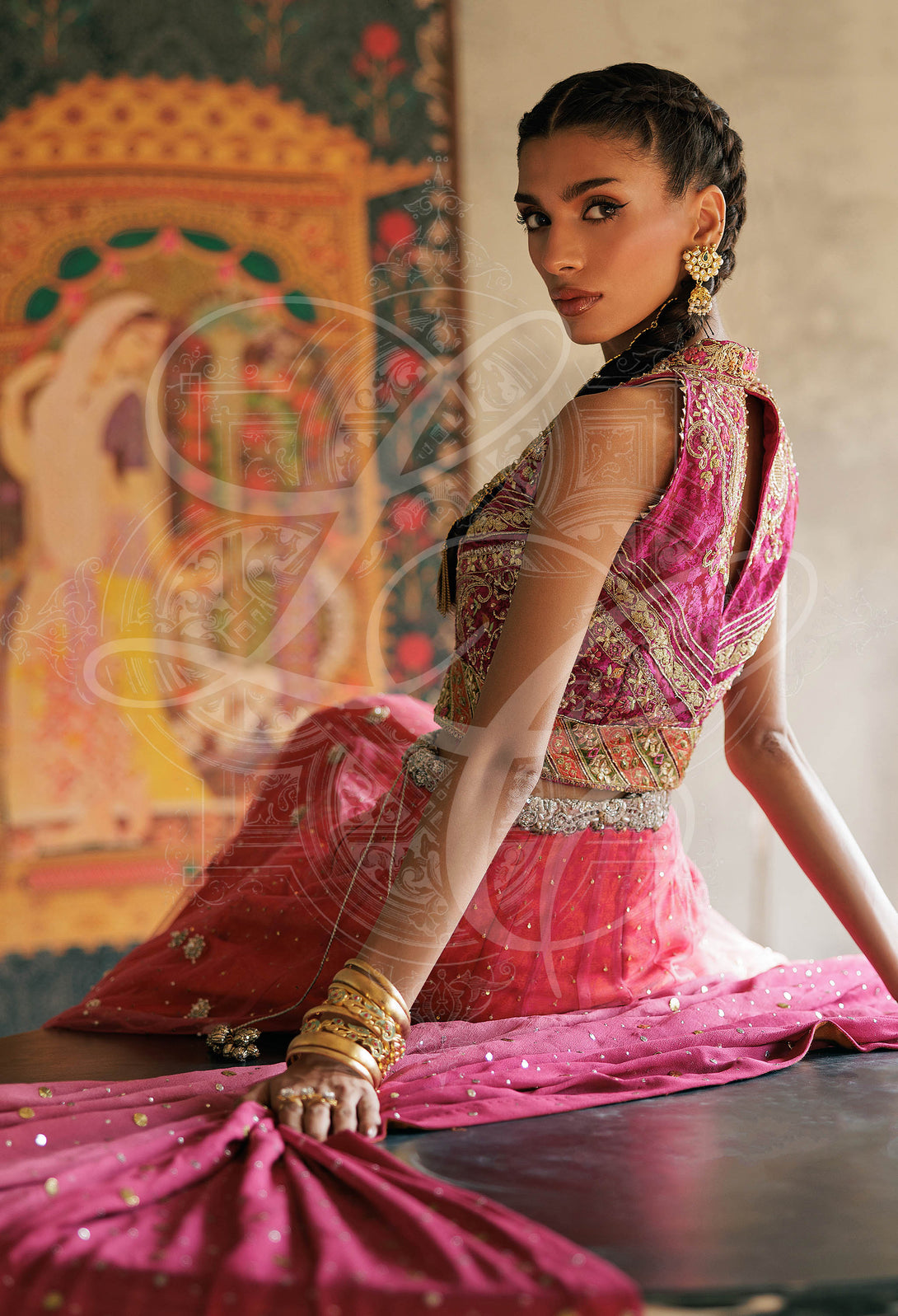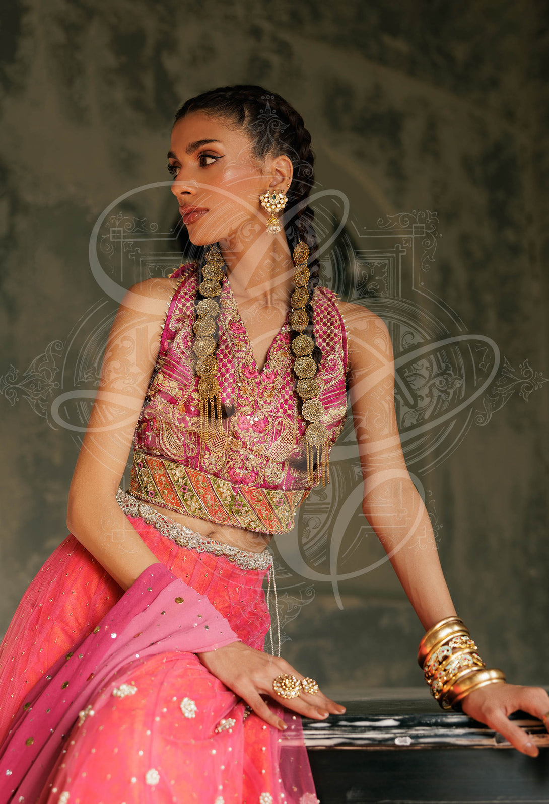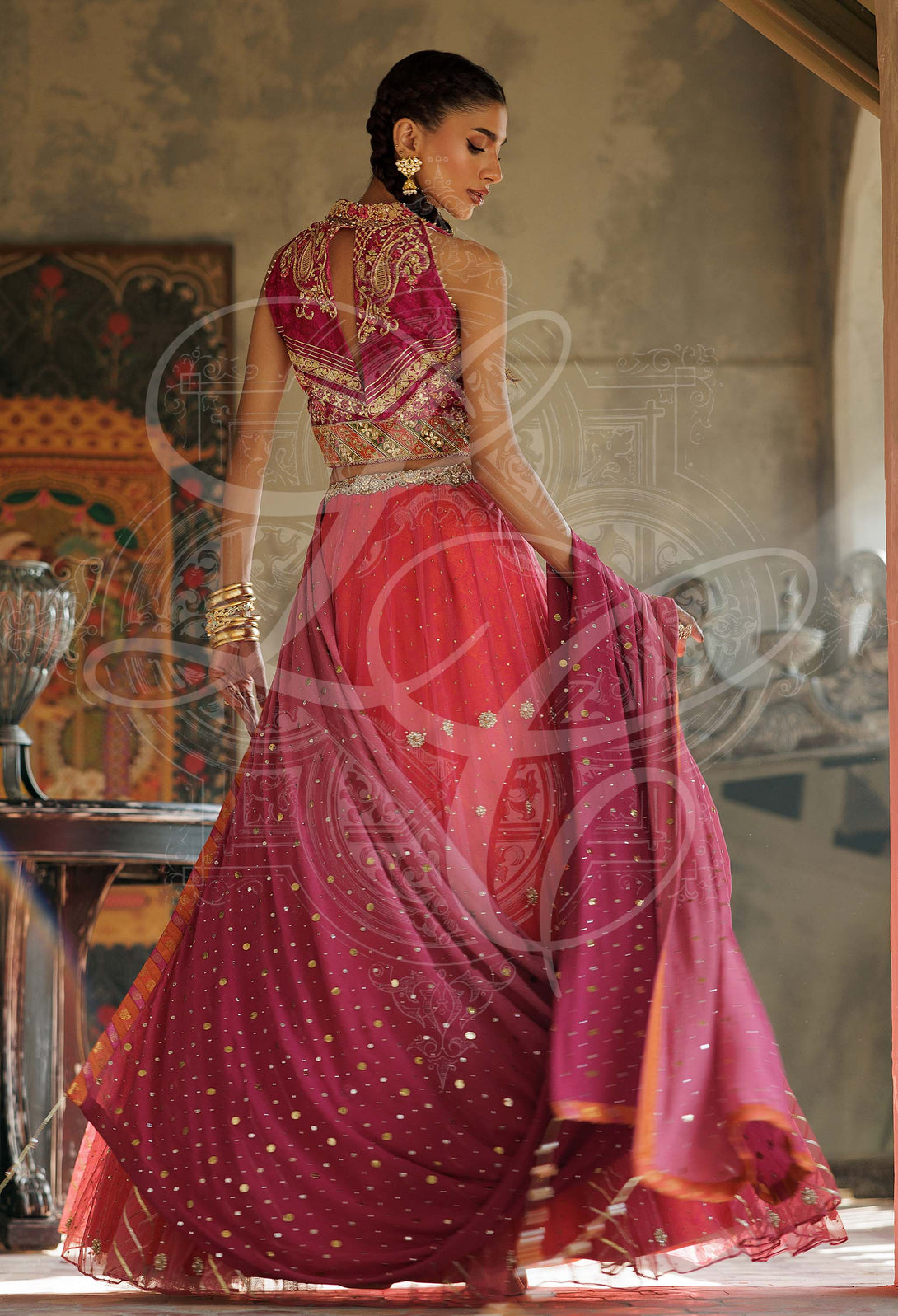 The ensemble is paired with a dramatic, flare-cut lehenga, generously layered and highlighted with gota-adorned panels, creating a striking, movement-filled silhouette. Completing the outfit is a kaamdani chiffon dupatta, featuring delicate handworked embroidery that subtly shimmers, adding a soft, ethereal layer to the overall design. Together, this set is a radiant choice for festive occasions, wedding celebrations, or statement evening wear.