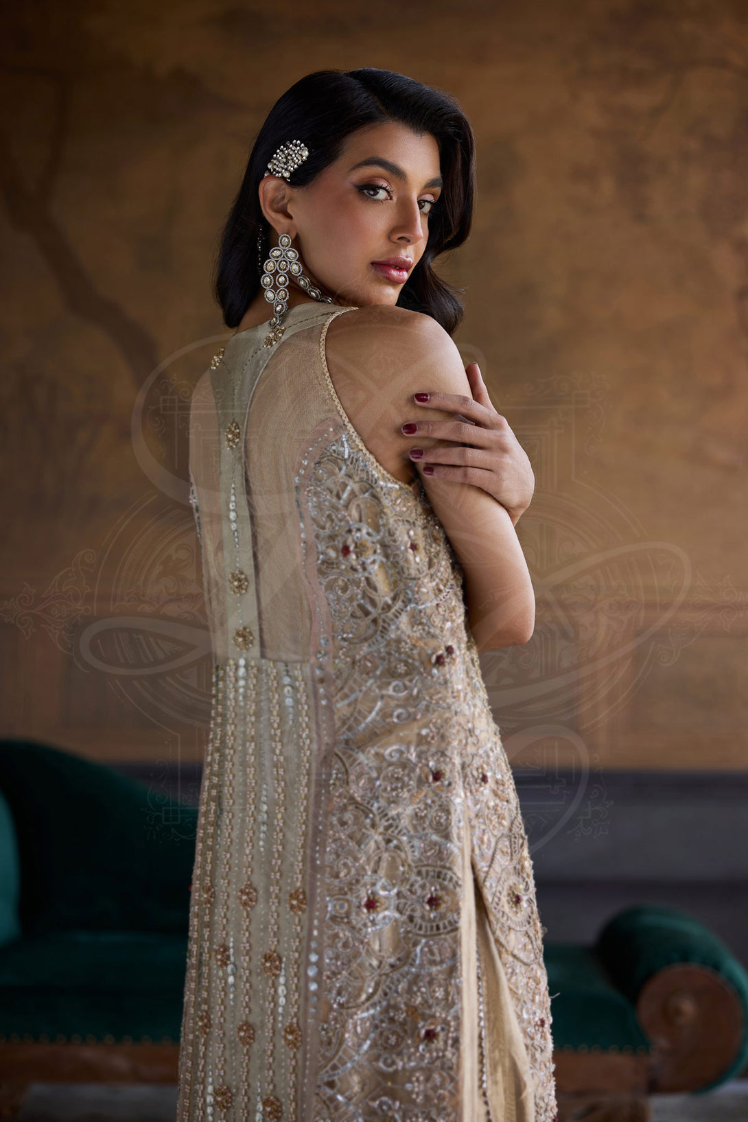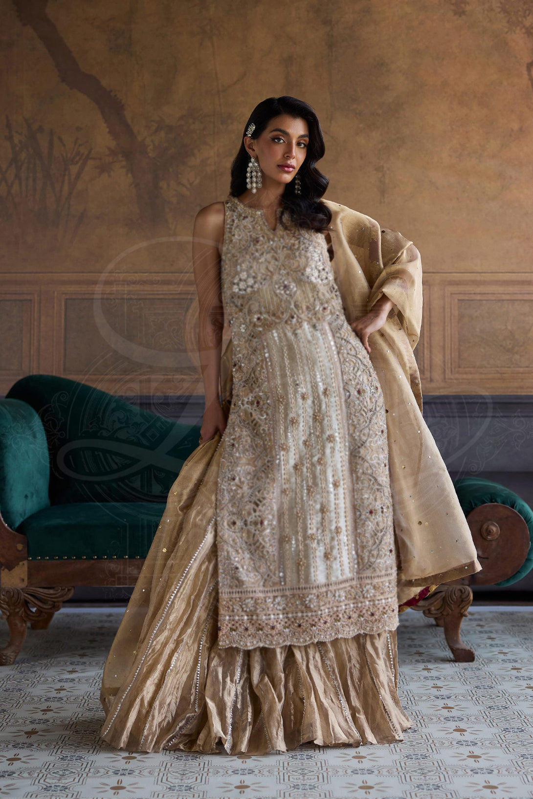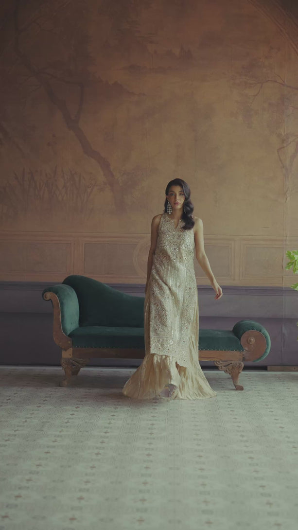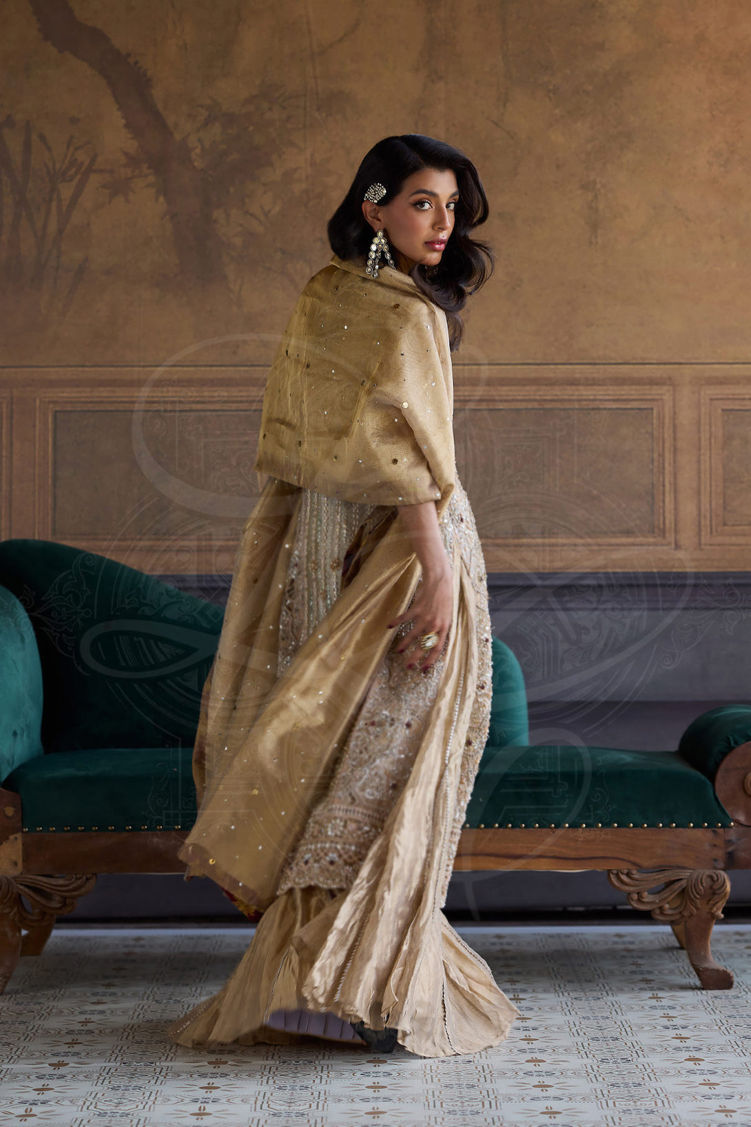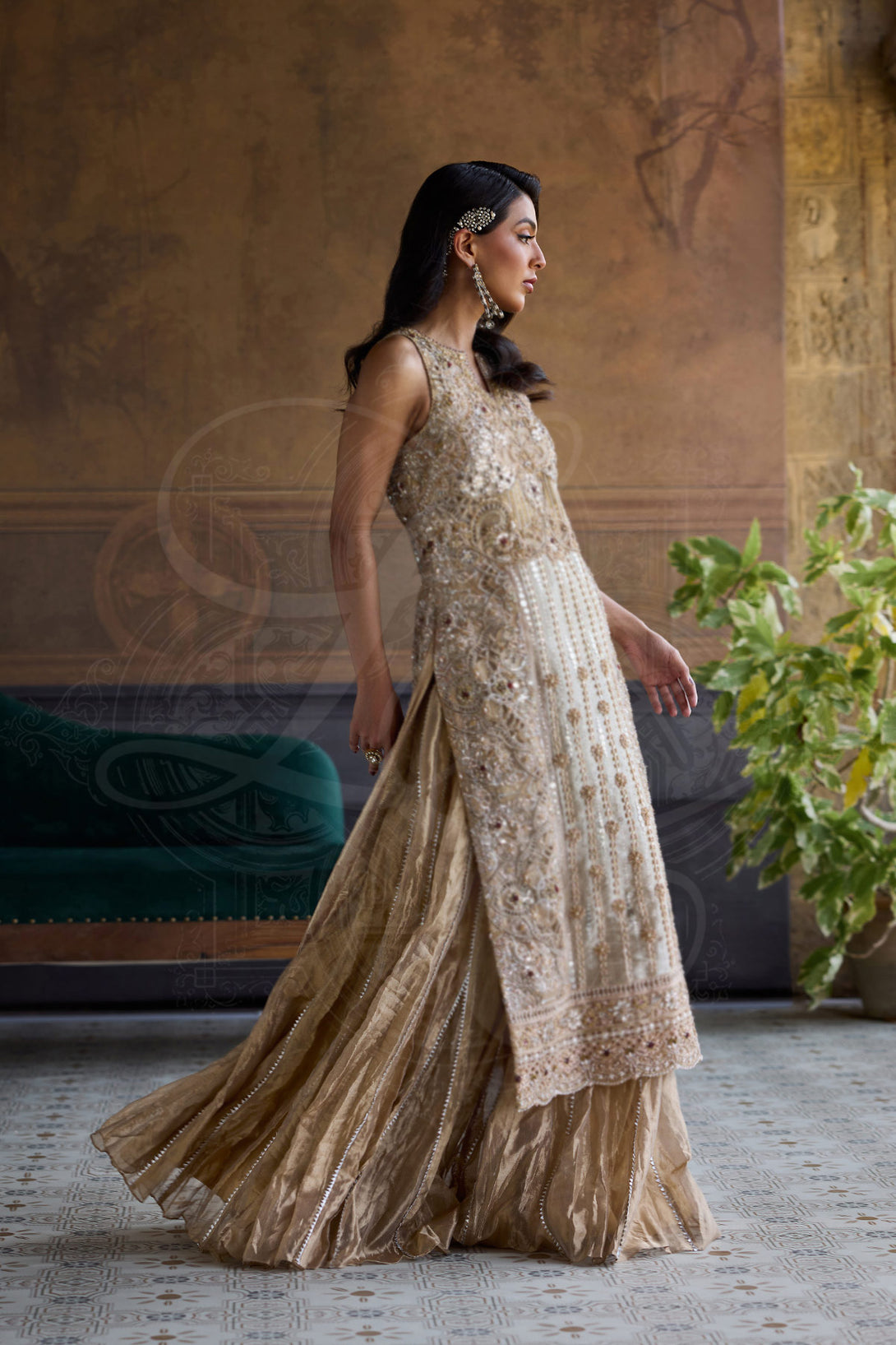 Biege and gold cutwork and Zardozi embellished long top with a gold crushed gharara and gold kaamdani lamé dupatta.